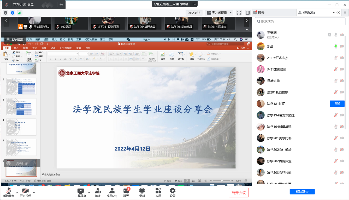 為全面了解民族學生居家學習情況,引導學生自我分析學業薄弱因素,樹立少數民族學生榜樣,4月12日,法學院召開線上少數民族學生學業座談分享會,學院全體本科22名維族、藏族同學參加,學院黨委副書記劉晶參加座談會。
