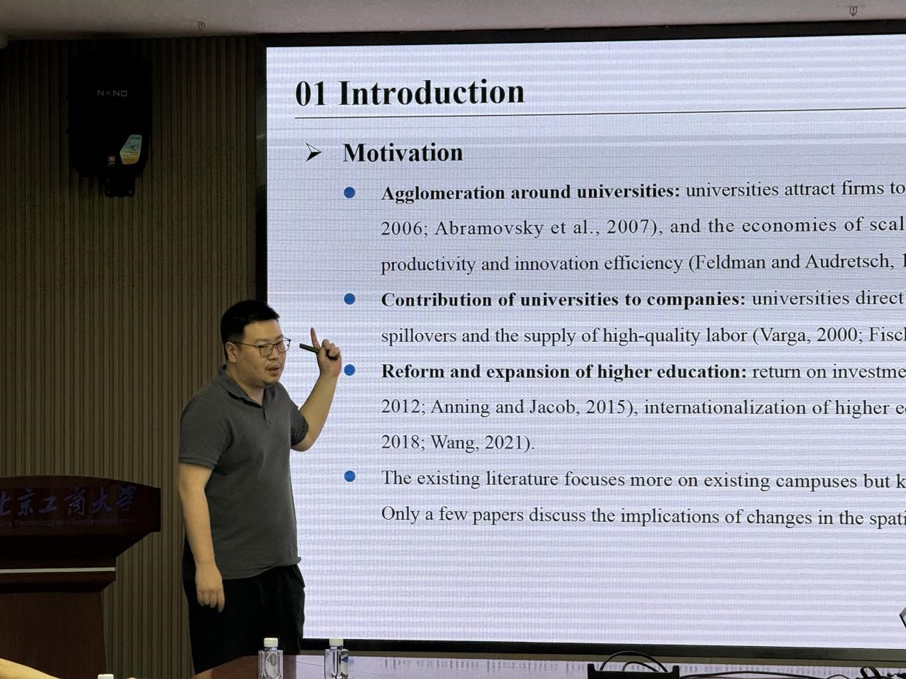 張凡老師報告了論文“More than a new campus: University's spatial expansion, emerging knowledge cluster, and innovation growth”。通過空間計量模型和雙重差分(新校區(qū)建設沖擊)的方法,研究了大學空間擴張對區(qū)域創(chuàng)新的影響。得出大學擴張通過知識溢出效應促進周邊創(chuàng)新集群形成,效應在理工科院校更顯著的結論。隨后,汪念玲教師點評建議需驗證機制(如產(chǎn)學研合作),建議分析政策配套(如人才引進)的調節(jié)作用。