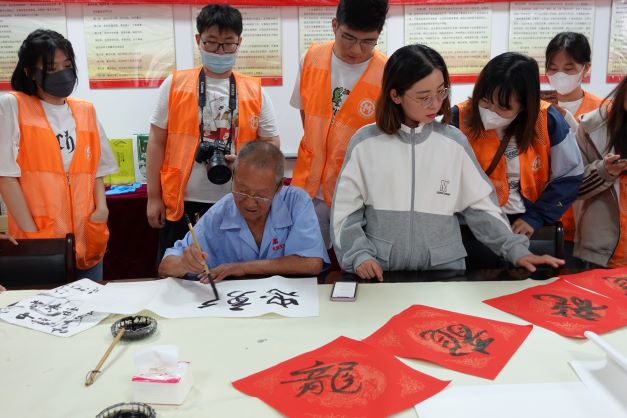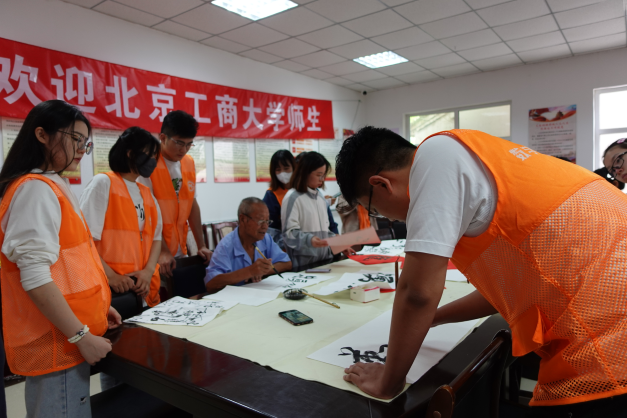 實踐期間,同學(xué)們走進村委會,與原村支部書記張寶珠老爺爺進行書法交流。正襟威坐,一個筆酣墨飽的“福“字完成了,雖然張爺爺已是耄耋之年,但他的筆法依舊蒼勁有力,他的思想與精神依舊躍然紙上。精神所在,就是血脈所在、力量所在,就是信念所在、希望所在。在書法交流的過程中,張爺爺根據(jù)實踐團成員幾天以來的調(diào)研,在宣紙上寫下”忠勇篤行 勤耕樂學(xué)“八個大字,字字鏗鏘,這是他對阜高營村風(fēng)民風(fēng)的總結(jié),更是對青年一代的期許,是青春的承接,亦是使命的傳遞。同學(xué)們牢記教誨,幾天里用腳步丈量土地,用心去感悟紅色精神,用筆書寫新時代新農(nóng)村的點點滴滴,用行動與這個時代同頻共振。