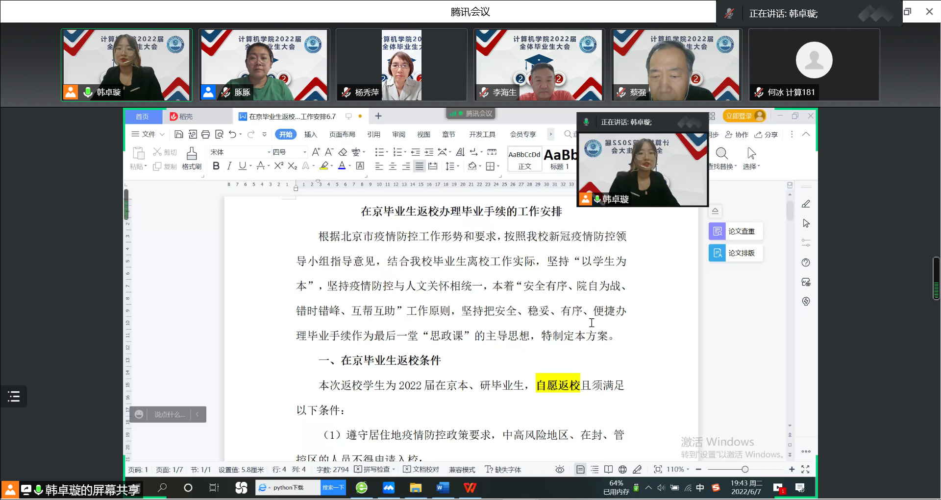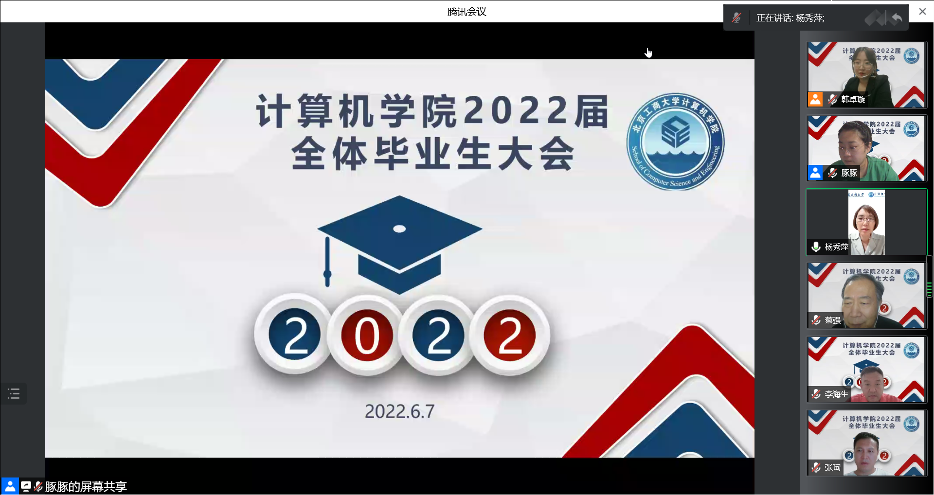 為了更好地服務(wù)學(xué)生,做好畢業(yè)離校各項(xiàng)工作,計(jì)算機(jī)學(xué)院于6月7日晚線上召開了學(xué)院2022屆全體畢業(yè)生大會(huì)。計(jì)算機(jī)學(xué)院黨委書記蔡強(qiáng)、執(zhí)行院長(zhǎng)李海生、黨委副書記楊秀萍、副院長(zhǎng)譚勵(lì),系主任、輔導(dǎo)員、畢業(yè)班班主任和導(dǎo)師以及全體本科和研究生畢業(yè)生參加了本次會(huì)議。會(huì)議由楊秀萍主持。
