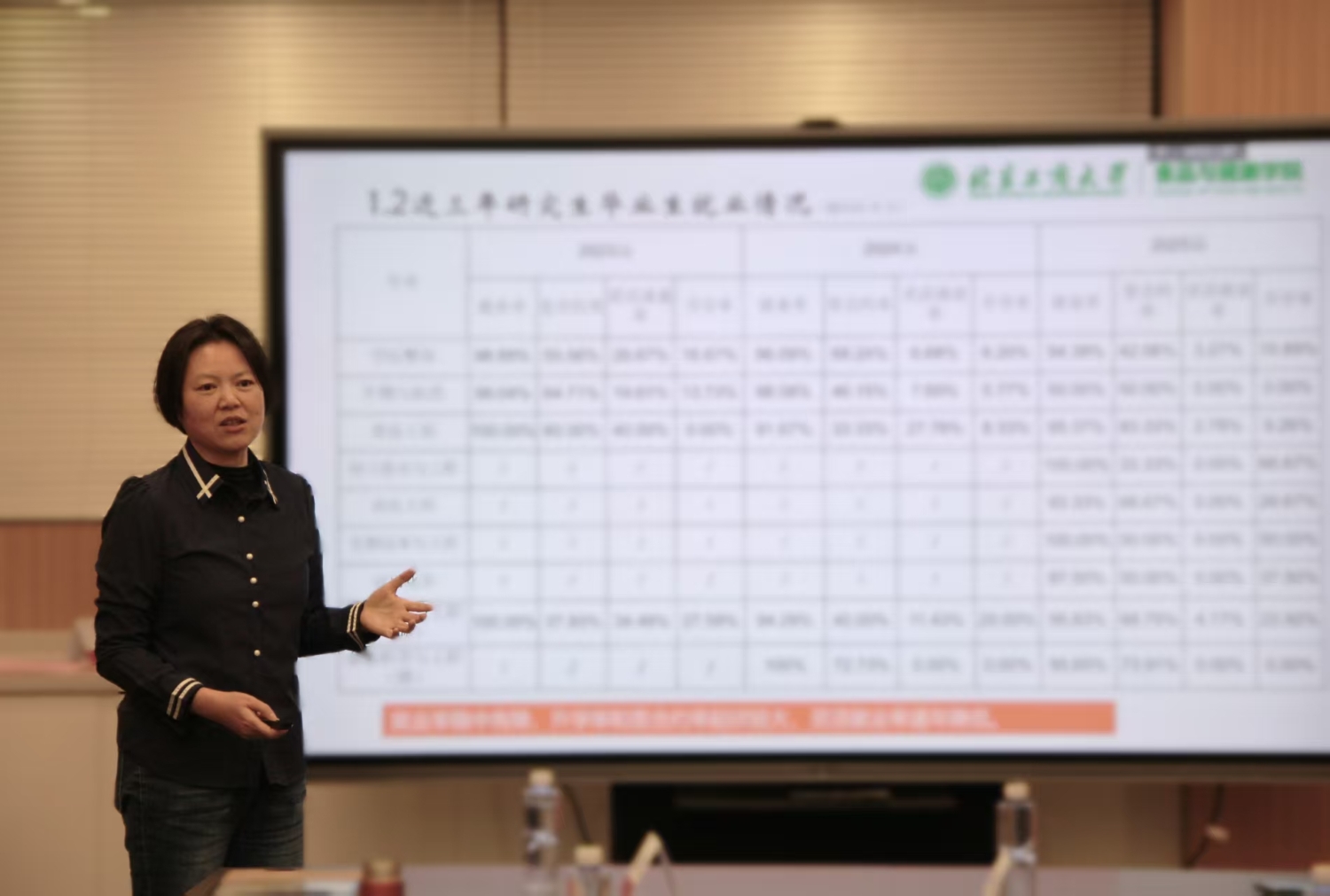 石松從教育的“三大屬性”切入,指出提高人才培養供需適配度是落實國家戰略部署的政治任務、是踐行教育為民宗旨的本質要求、是建設教育強國的戰略支點。她詳細分析了食品與健康學院2025年招生數據和畢業生就業領域單位,論證了引導學生“有工作、好工作、有貢獻”的三個境界層次,闡明了系統構建一體化供需適配管理機制的迫切性和必要性,繼而傳達了《北京工商大學人才培養供需適配機制改革試點工作實施方案》,詳盡解讀了構建動態調整的“招生-培養-就業”聯動機制、建立快速響應市場需求的人才培養供給機制、全鏈條優化提升畢業生高質量就業指導服務等三項主要內容,鼓勵食品與健康學院以社會需求為導向、以就業為切口,促進學科專業結構優化和人才培養改革,實現畢業生“高就業率、高就業質量、高職業發展潛力”。