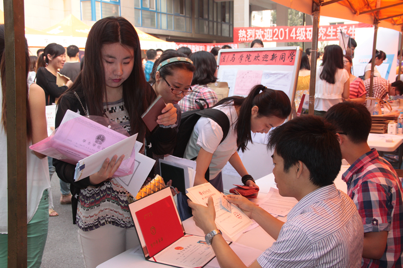 9月10日上午,法/馬學院迎接2014級新生工作在東區雙子樓下正式拉開帷幕。院長張秀芬、黨支部副書記文四英、研究生輔導員朱艷新親臨現場,統一指揮協調迎新工作。研究生會成員及部分學生干部等也齊聚迎新現場,仔細審核新生錄取通知書等重要材料,引導每一位新生順利辦理簽到、領飯卡、查詢宿舍、資料領取等一切入學手續,并耐心的對新生報到中的疑問進行講解,細心提醒新生應該注意的事項。