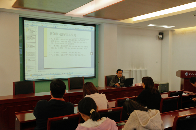 邱乾謀為大家簡要介紹了新聞報道真實性、準確性、公平性和平衡性的基本原則及采訪的主要方式。針對如何發現新聞的問題,他提出作為新聞通訊員要學會從會議、文件、活動、調研成果、學校規章、教室、宿舍、圖書館里尋找新聞,并結合實例為大家進行了講解。結合高校新聞宣傳需求,邱乾謀重點講解了消息和通訊的具體寫法和區別。他還以我校新聞網、后勤部門網站上發布的新聞為例,具體講解了如何撰寫會議新聞、校園活動報道,如何挖掘新聞價值及新聞圖片的選擇等內容。