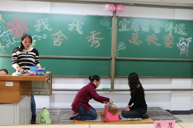 決賽分為才藝展示和知識(shí)問答環(huán)節(jié)。各宿舍成員精心準(zhǔn)備,為老師和同學(xué)們帶來精彩紛呈的表演。商學(xué)院的小品《同學(xué)會(huì)》,以同學(xué)聚會(huì)為切入點(diǎn),借助反腐題材寓意堅(jiān)守“勿忘初心,潔身自好”的珍貴品質(zhì)。法/馬學(xué)院 “竹里居”宿舍的茶藝展示,融合茶道展示和解說,為大家?guī)泶己窀侍鸩杷耐瑫r(shí),也讓大家領(lǐng)略到中國高雅的傳統(tǒng)茶文化的獨(dú)特魅力。激昂高亢的詩朗誦《我的成長,我的夢(mèng)》,展示了新一代研究生蓬勃的朝氣,積極向上的精神面貌。巧妙的折紙表演,揮灑自如的書法表演,炫酷的吉他演奏、動(dòng)聽的宿舍合唱等也贏得大家不斷喝彩,現(xiàn)場氣氛異常活躍。隨后,宿舍成員隨機(jī)抽取題目進(jìn)行知識(shí)問答,內(nèi)容涉及安全知識(shí)、生活常識(shí)、宿舍裝飾設(shè)計(jì)等。通過此環(huán)節(jié),擴(kuò)展了同學(xué)們的視野,同時(shí)也加深了同學(xué)們的安全防患意識(shí)。經(jīng)過激烈的角逐,比賽共評(píng)選出精品宿舍5間,一等獎(jiǎng)宿舍15間。