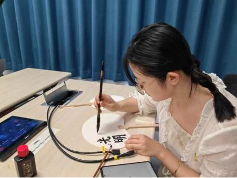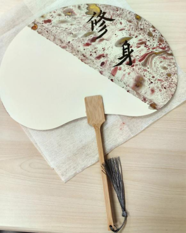 在社團(tuán)社員的的指導(dǎo)下,在場(chǎng)學(xué)生黨員分工協(xié)作,分組制作漆扇。“修身”“自省”“廉潔”“明德”……大家紛紛用筆墨在空白扇子上書(shū)寫(xiě)所思所感所愿,繼而在水漆中或平入、或旋轉(zhuǎn)、或輕搖,鋪在紙上靜待晾干,一柄柄典雅明麗、獨(dú)一無(wú)二的漆扇制作完成,握在手中,陣陣清風(fēng)在盛夏時(shí)節(jié)拂面而來(lái)。