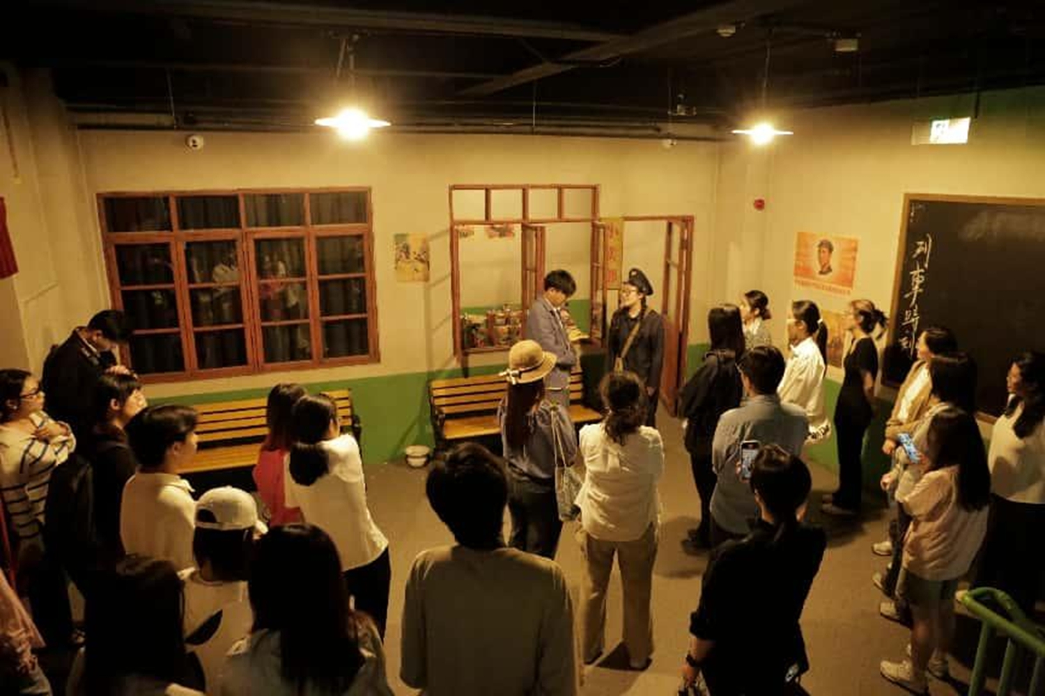 在“沉浸式”黨課《足跡》體驗(yàn)環(huán)節(jié)中,在聲光電多媒體互動(dòng)系統(tǒng)支持下,教學(xué)內(nèi)容以全景方式鋪陳展開,師生們不僅能夠視覺、聽覺同步沉浸,還通過劇場式互動(dòng)設(shè)置,親身參與到劇情之中——成為焦裕祿同志的同事,在不同身份視角中切身體會(huì)他為治沙治澇、排鹽種樹、走村訪戶所經(jīng)歷的艱辛與信仰。當(dāng)教學(xué)場景定格于焦裕祿手捧黃土、頂風(fēng)踏雪深入沙丘調(diào)研的畫面時(shí),一句“吃別人嚼過的饃沒味道”回蕩在空間中,震撼直抵人心。