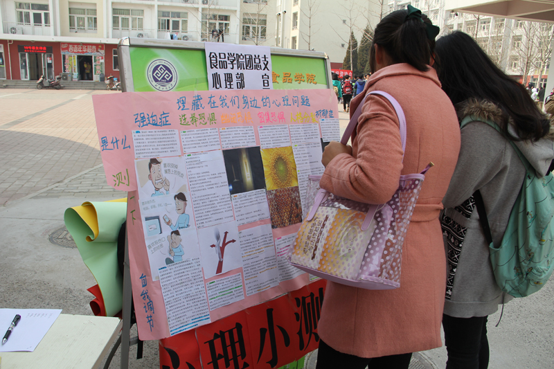 本次心理健康節以“開心見誠——貴在知心”為主題,將埋藏在我們身邊的常見心理問題一一列舉,活動采用展板的方式進行,并加以詳細注解和分析,使同學們對抑郁癥、人格分裂等心理問題有了一個初步的了解。活動現場同學們通過心理健康測試并結合展板上的內容,來初步判斷自己的心理健康狀況,心理部成員就大家的測試情況給出相應的心理輔助措施。