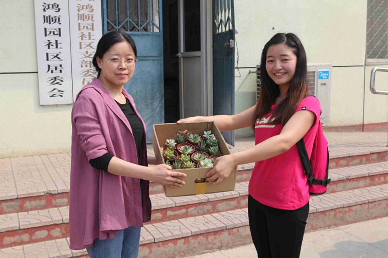 在鴻順園社區,商學院黨員志愿服務團將新鮮的綠植帶到社區分發給社區居民們,為社區增添新的生機。鴻順園社區黨支部書記張賢表示,此次活動的開展意義重大,公益環保活動正是社區所缺少的項目,此次活動可以喚起社區居民對公益環保事業的關注,從自己做起,為環保公益貢獻自己的力量。