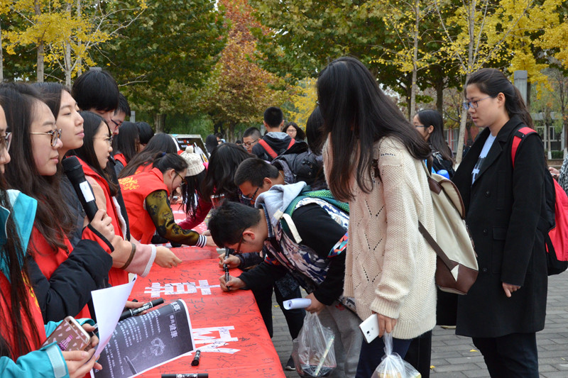 為了進(jìn)一步貫徹落實(shí)《北京市控制吸煙條例》,營(yíng)造健康向上的文明校園環(huán)境,11月16日商學(xué)院在良鄉(xiāng)校區(qū)舉辦了2015年“遠(yuǎn)離煙草,崇尚健康”無(wú)煙校園千人簽名活動(dòng)。商學(xué)院黨委副書(shū)記樊江濤、輔導(dǎo)員們以及近千名師生參加簽名活動(dòng)。