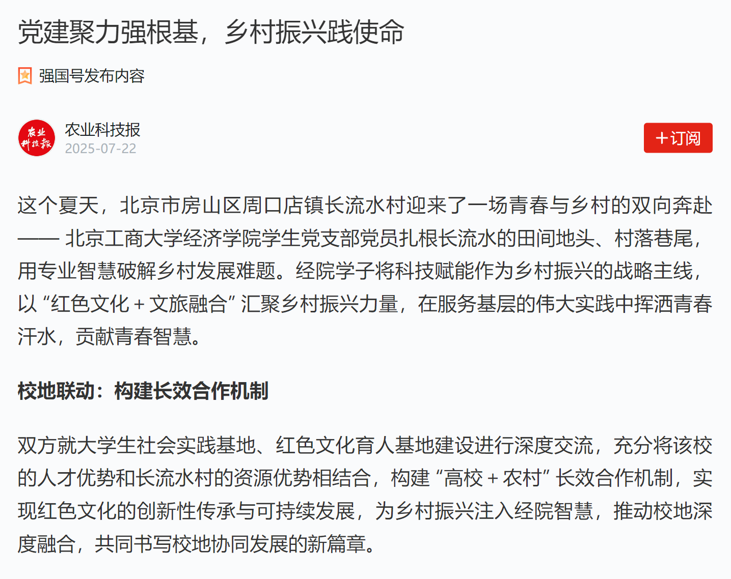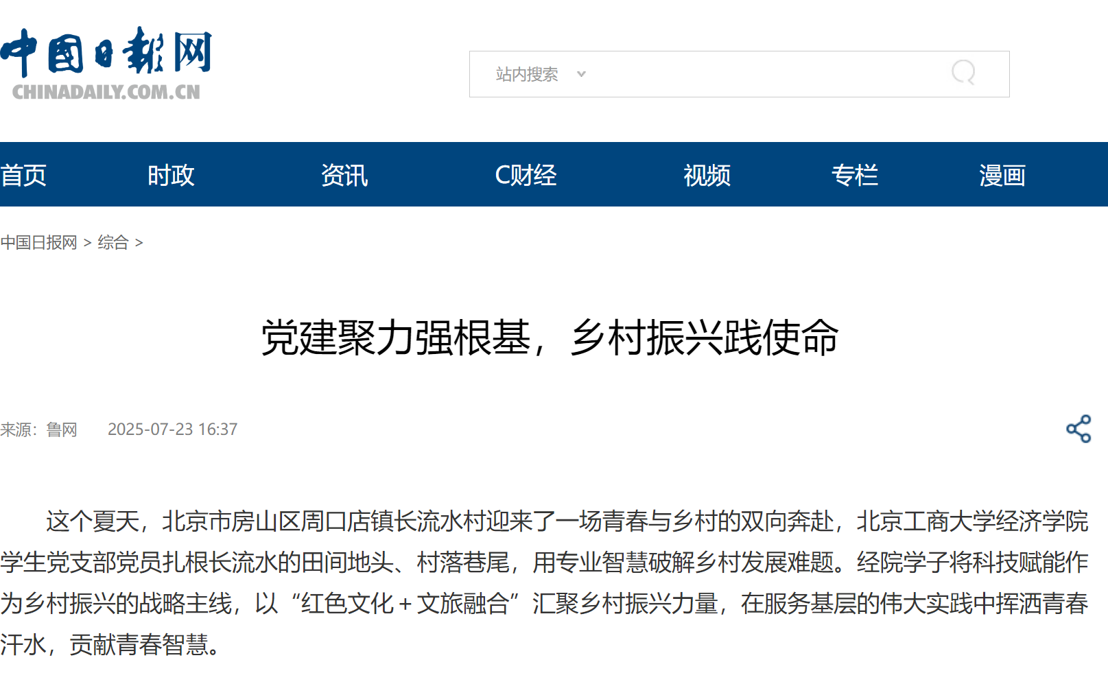 近日,學習強國、中國鄉村振興網、中國日報網等多家媒體以《黨建聚力強根基,鄉村振興踐使命》為題,報道北京工商大學經濟學院紅色“1+1”學生黨支部實踐活動。