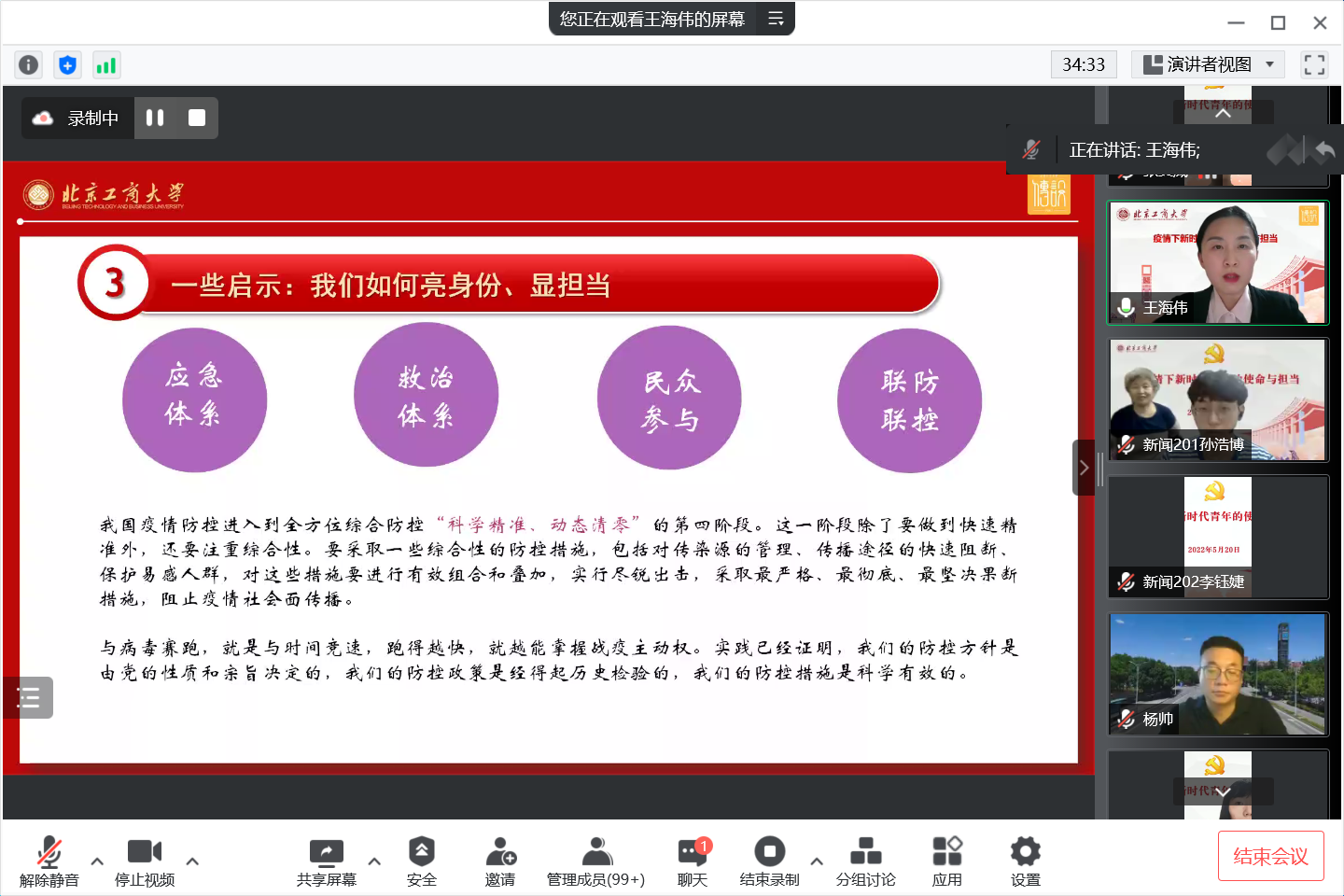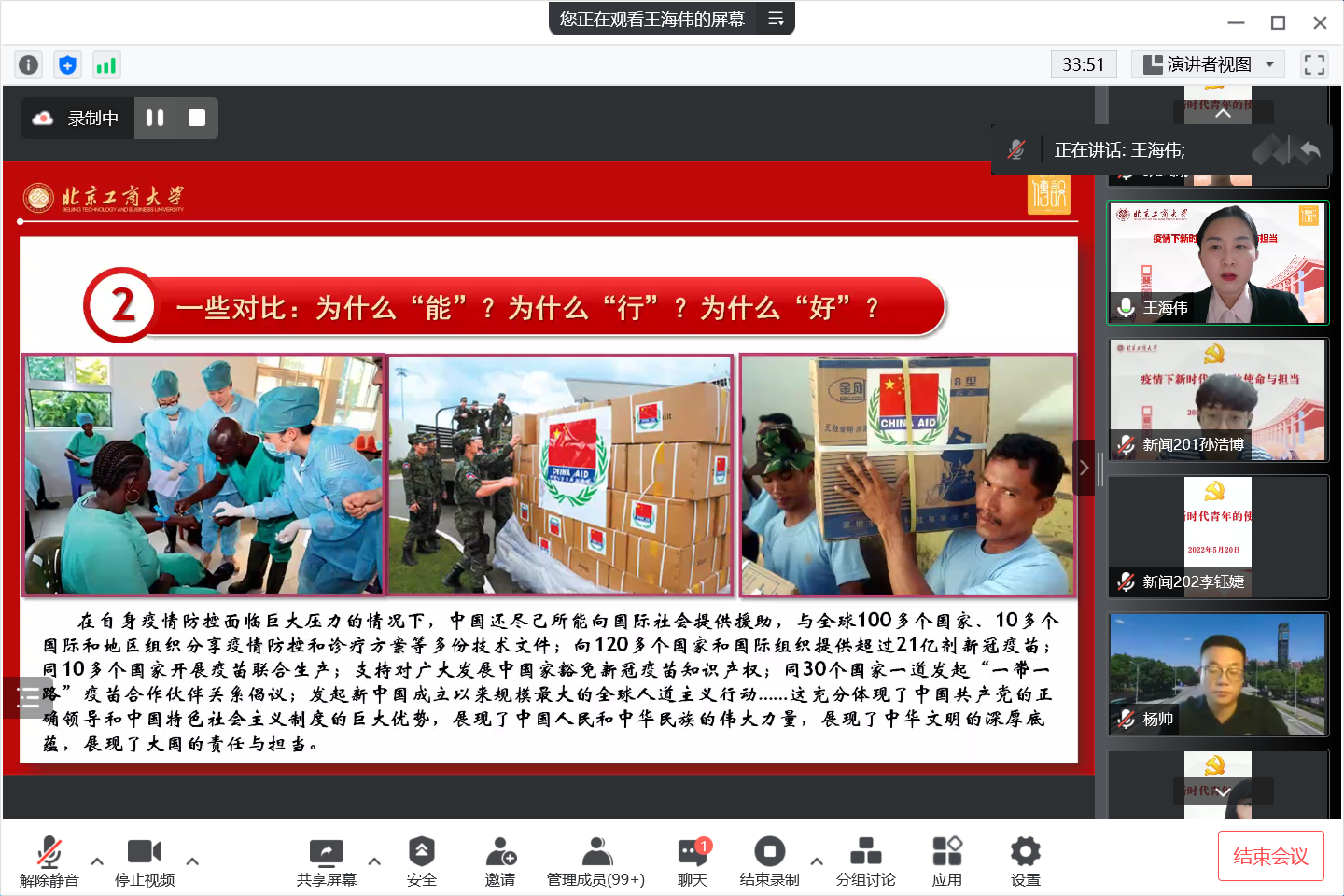 王海偉以《疫情下新時代青年的使命與擔當》為題,從目前疫情防控整體形勢分析出發,圍繞疫情防控中的一些記憶、對比、啟示與思考等四個方面講授。她表示新冠病毒疫情防控攻堅戰是一場現實的思政課,一堂鮮活深刻的思政課,也是一堂難忘的思政課。她帶領師生共同回顧了疫情防控以來學院師生主動投身校內外抗擊疫情的生動事跡,充分彰顯了學院師生黨員的責任與擔當。提醒師生居家學習工作期間保護好自己和家人,呼吁師生們要堅定信心,自覺在思想上、政治上、行動上與黨中央保持高度一致。通過與國外抗疫數據對比,指出我國動態清零的疫情防控政策,最大限度的保護了人民群眾人身財產安全,是人民至上,生命至上的最好詮釋,體現了黨始終把為中國人民謀幸福,為中華民族謀復興作為自己的初心使命,充分彰顯了黨領導的政治優勢和中國特色社會主義制度的顯著優勢。