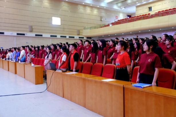 升國旗,全場師生莊嚴(yán)奏唱國歌。