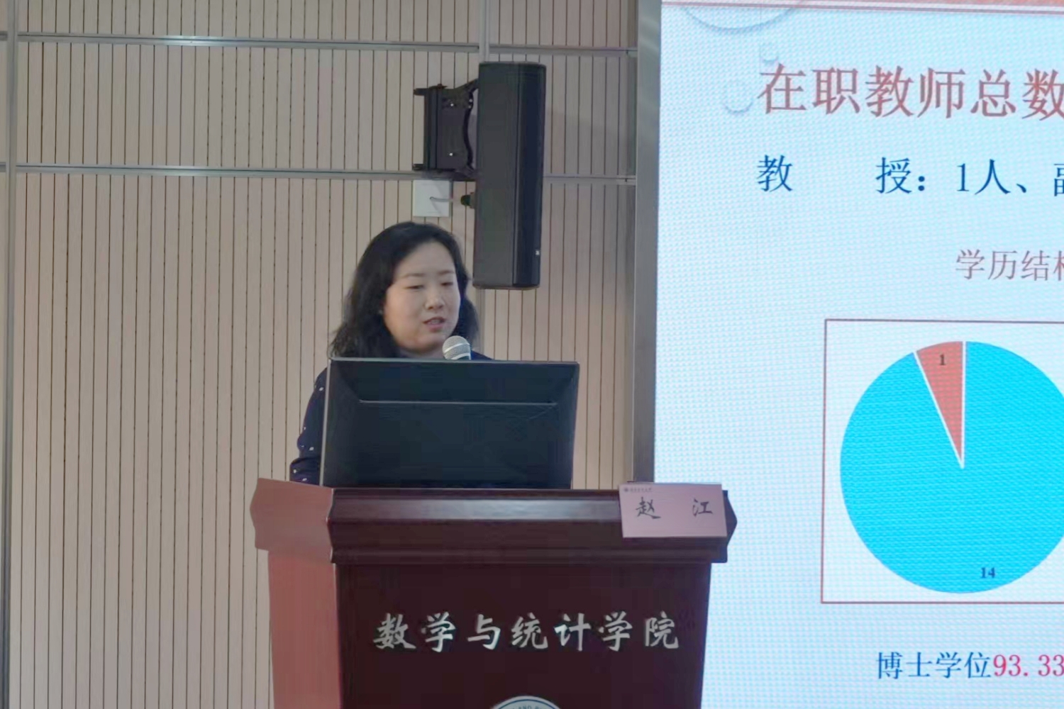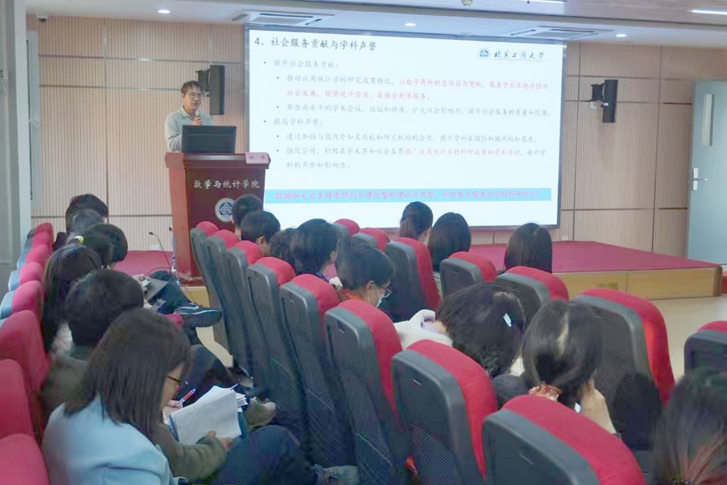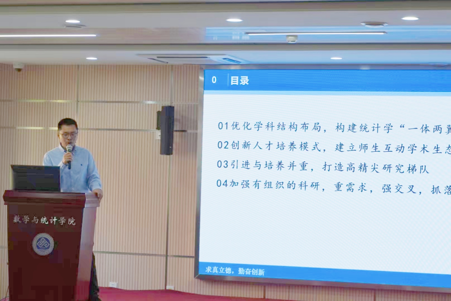 數學與統計學院副院長王康以“錨定一流學科,突出交叉特色,明晰戰略定位”為主題,圍繞學科布局、人才培養、研究梯隊和科研發展四個方面進行專題匯報。應用統計系主任謝峰、數據科學系主任岳美玲、經濟統計系主任趙江分別就各系的基本情況、研究方向和未來規劃進行了匯報交流。