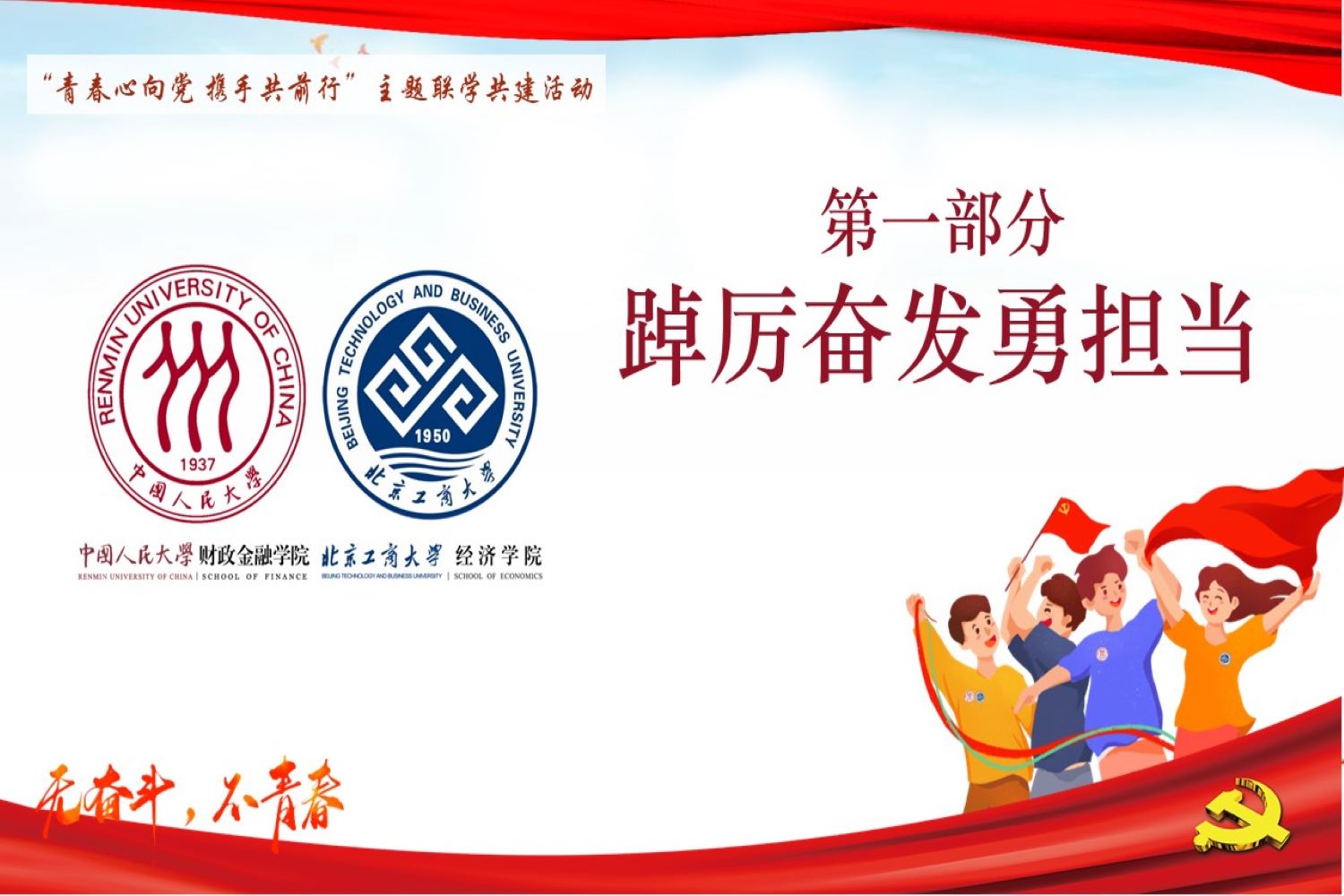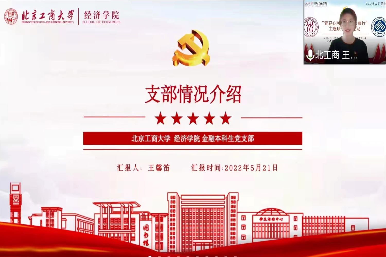 本次聯學共建活動共分為“踔厲奮發勇擔當”、“建團百年正青春”和“黨建領航聚合力”三個篇章。我校經濟學院金融本科生黨支部書記王馨笛與中國人民大學財政金融學院本科金融第五黨支部書記張奇樂分別介紹了各支部的人員組成、建設現狀與未來目標。