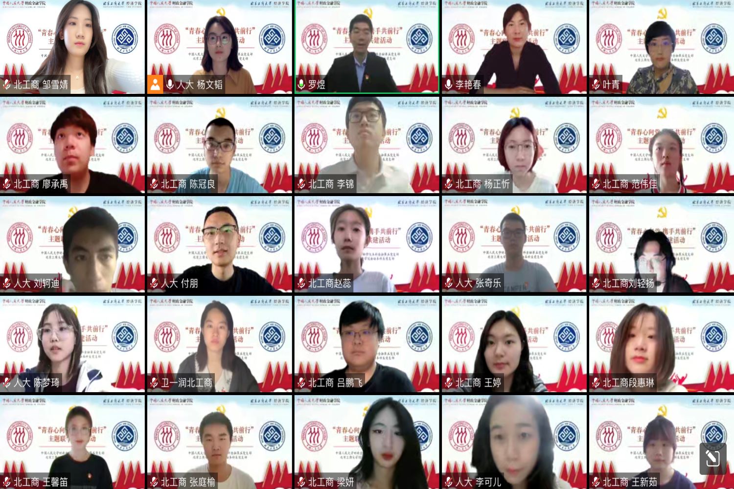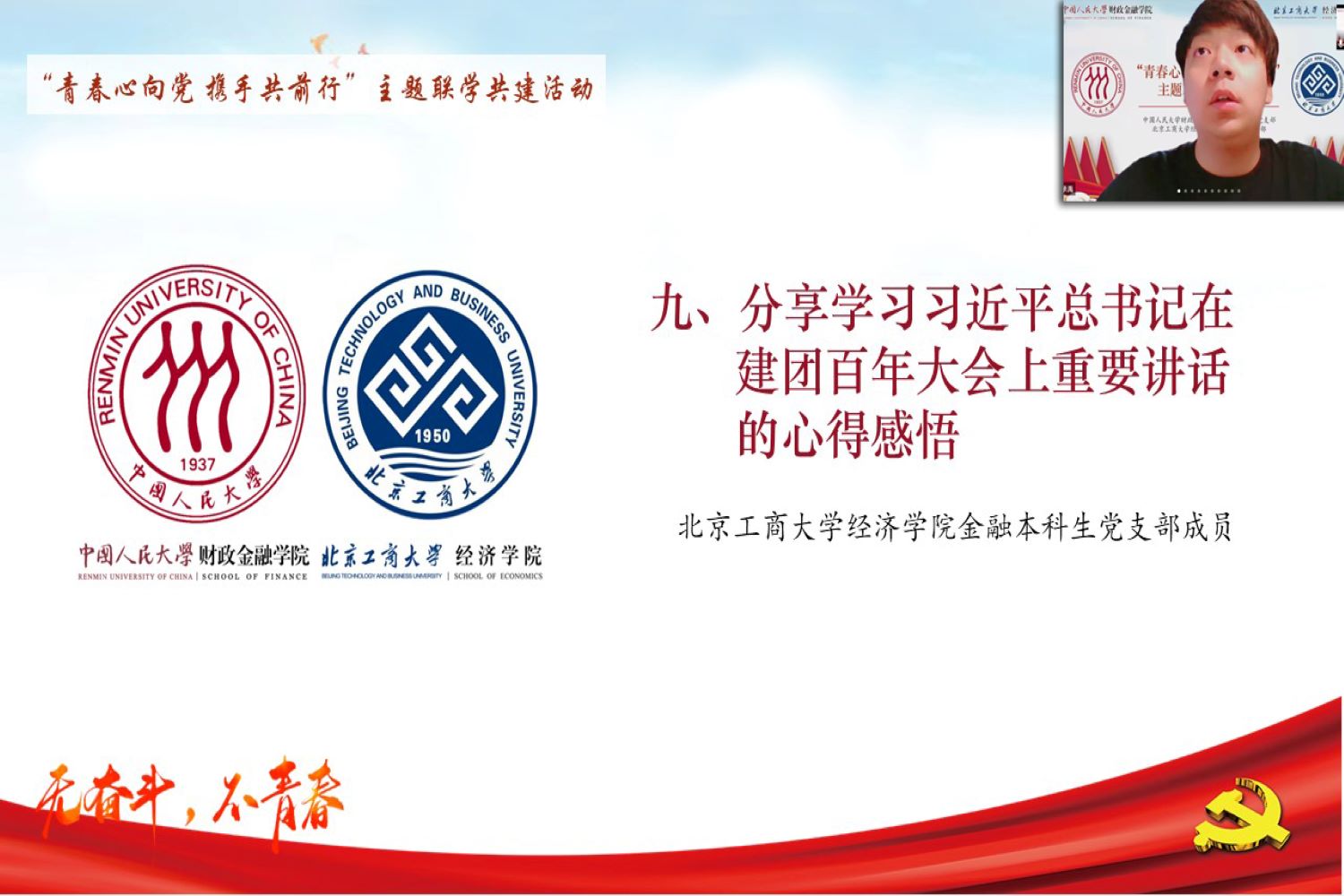 羅煜進行了總結。他講述了自己在人民大學工作近年來與北京工商大學經濟學院的淵源和情愫,表示此次聯學共建活動不僅是兩校間的友好互動,更是兩支部間共同促進、相互學習的寶貴契機。在“黨辦的大學讓黨放心,人民的大學不負人民”的歷史責任與時代擔當之下,青年學子們應切實踐行強國先鋒、復興棟梁的青春使命,牢記習近平總書記的諄諄教導,在防疫、科研、社會服務等各個領域中發揮先鋒模范作用,成為堪當大任的國之棟梁。