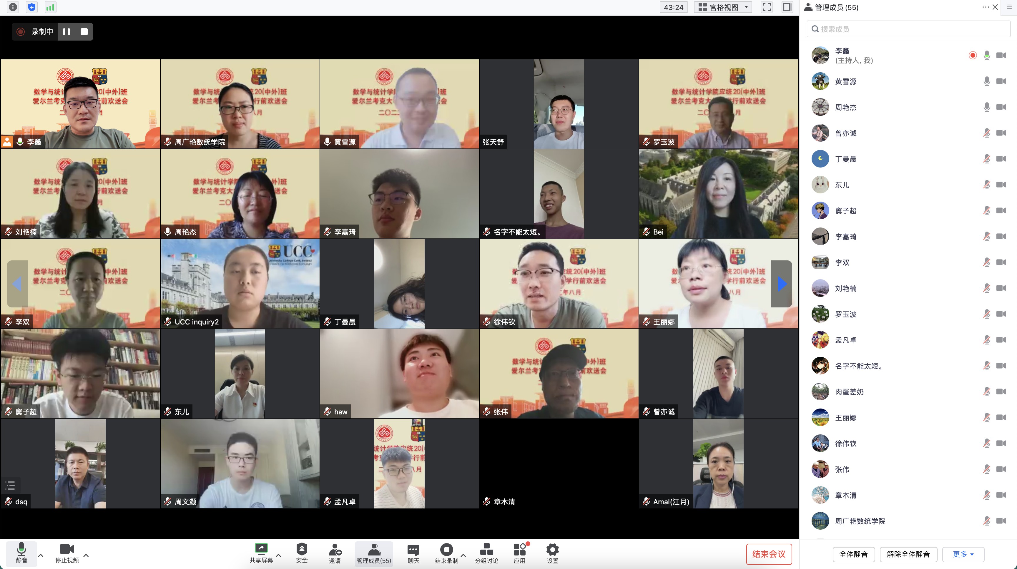 8月31日,數(shù)學與統(tǒng)計學院通過線上會議的形式,舉辦中外合作辦學(風險與精算)專業(yè)赴愛爾蘭留學行前歡送會。學校教務處處長曹顯兵、國際交流與合作處副處長(主持工作)賀冬萌、愛爾蘭中國辦公室主任張蓓,數(shù)學與統(tǒng)計學院黨委書記周艷杰、院長劉艷楠、黨委副書記徐偉欽、副院長羅玉波,輔導員以及應統(tǒng)20(中外)班出國學生和家長參加會議,本次會議由數(shù)學與統(tǒng)計學院副院長黃雪源主持。