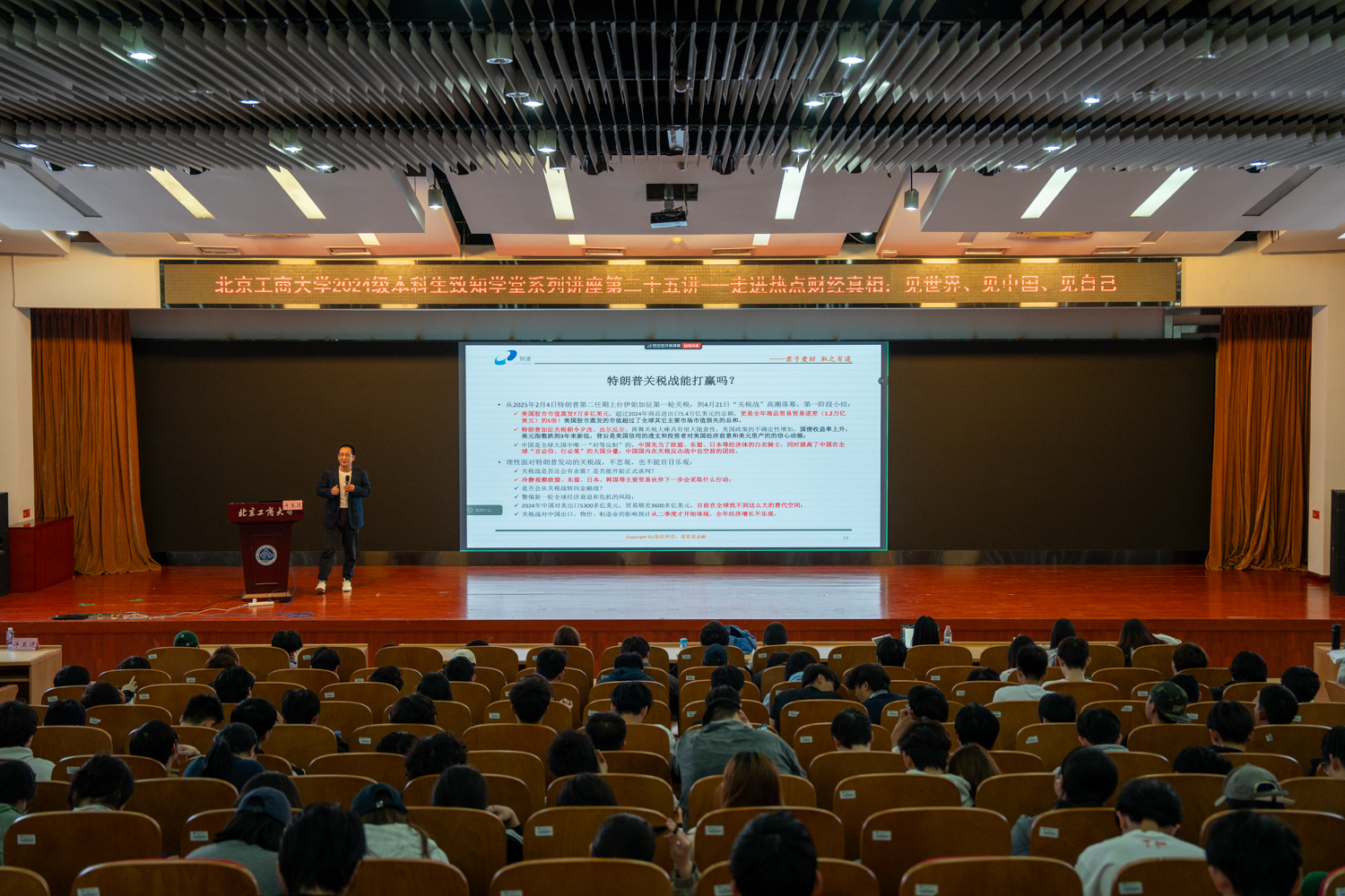 2025年4月22日,北京工商大學(xué)良鄉(xiāng)校區(qū)A報告廳開展2025年“致知學(xué)堂”系列講座第五講:走進(jìn)熱點財經(jīng)真相:見世界、見世界、見自己。北京財?shù)揽萍糃EO許玉道,圍繞“世界八百年未有之大變局”“新一輪全球科技革命”“中國機(jī)遇與挑戰(zhàn)”三大主題,通過案例結(jié)合方式,深入淺出地為學(xué)生解讀中國財經(jīng)格局。