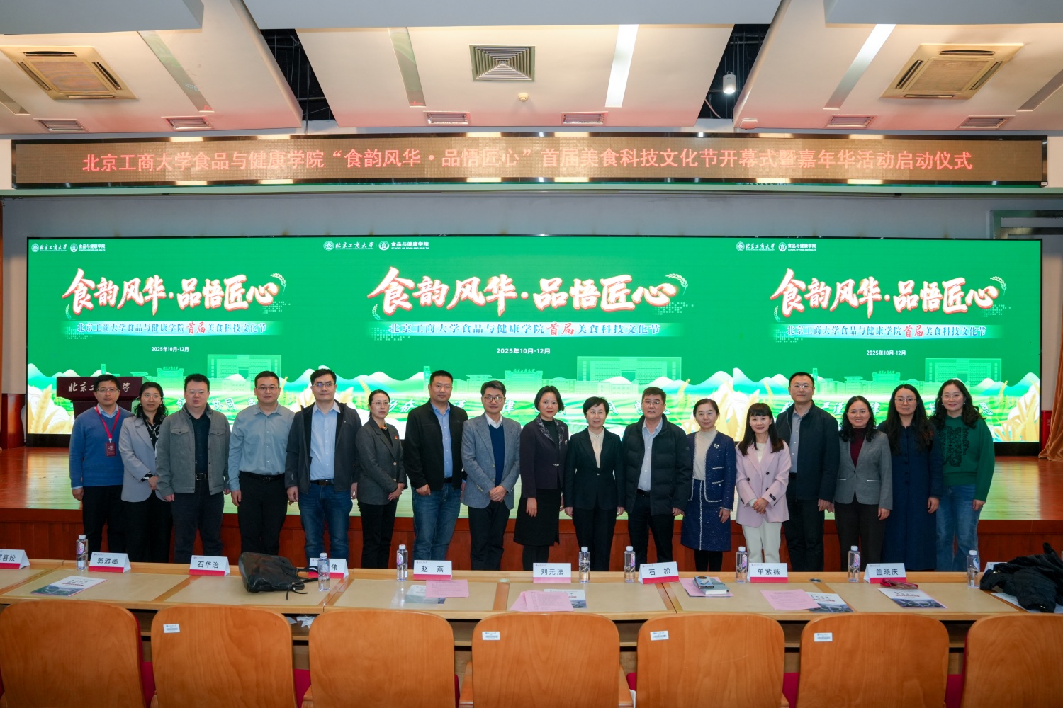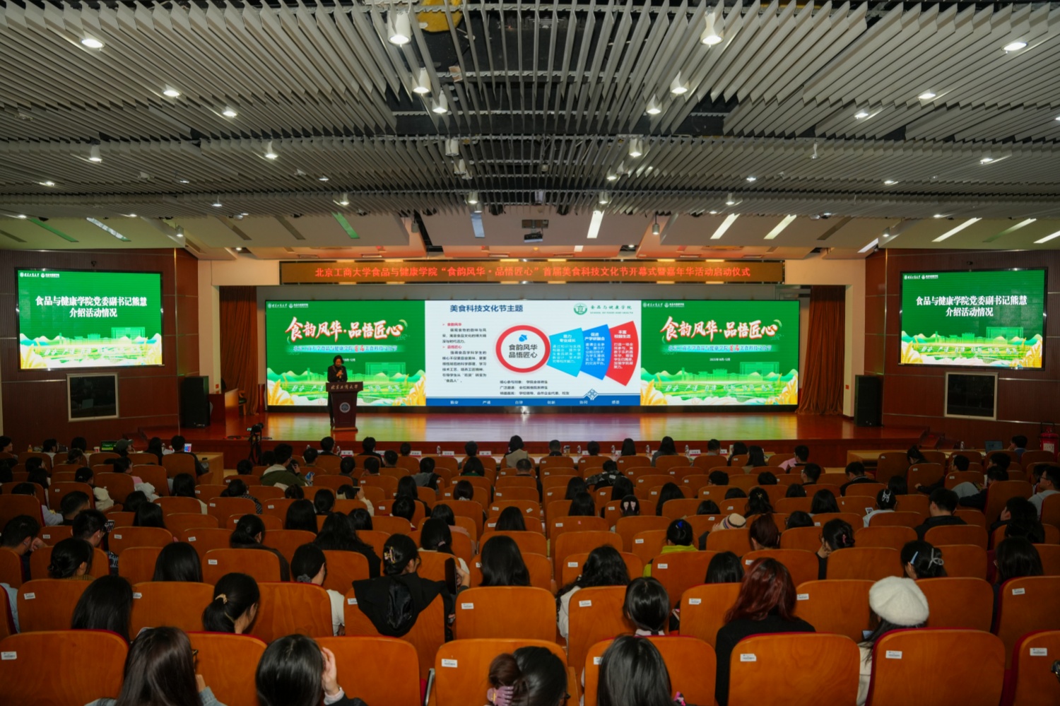 11月5日,食品與健康學(xué)院“食韻風(fēng)華?品悟匠心” 首屆美食科技文化節(jié)開幕式暨嘉年華活動(dòng)啟動(dòng)儀式在良鄉(xiāng)主校區(qū)學(xué)術(shù)報(bào)告廳舉行。來自北京食品科學(xué)研究院、中國食品藥品企業(yè)質(zhì)量安全促進(jìn)會(huì)、北京同仁堂健康藥業(yè)股份有限公司、同仁堂藥酒廠、北京北冰洋食品有限公司、北京神州味業(yè)科技有限公司等特邀行業(yè)和校友嘉賓,學(xué)校發(fā)展規(guī)劃處處長劉元法、招生就業(yè)處處長石松、團(tuán)委書記單紫薇、教務(wù)處副處長蓋曉慶、學(xué)院全體領(lǐng)導(dǎo)、各系黨支部書記、系主任、教師代表、輔導(dǎo)員及在校本研學(xué)生300余人齊聚一堂,共同見證活動(dòng)啟幕,儀式由學(xué)院黨委副書記熊慧主持。