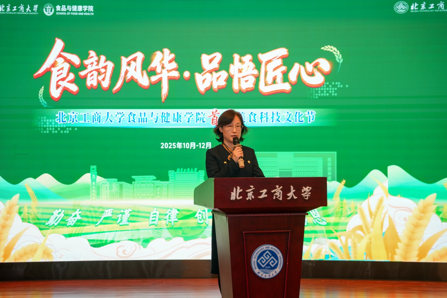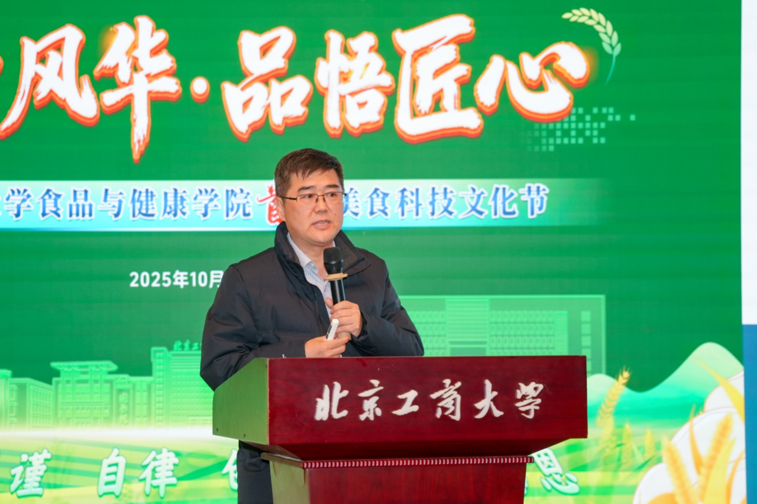 食品與健康學(xué)院院長王彥波致辭,向蒞臨活動(dòng)現(xiàn)場的各界嘉賓表示熱烈歡迎和衷心感謝。他談到,學(xué)院始終堅(jiān)持服務(wù)國家戰(zhàn)略、服務(wù)新時(shí)代首都發(fā)展的使命,以“工商一體化”理念為引領(lǐng),推動(dòng)學(xué)科交叉融合,在“AI+食品健康”“智能檢測技術(shù)”“功能性食品研發(fā)”等前沿方向持續(xù)突破。他鼓勵(lì)同學(xué)們以美食科技文化節(jié)為“科創(chuàng)練兵場”,主動(dòng)走進(jìn)美食嘉年華和企業(yè)嘉年華,在互動(dòng)中深化專業(yè)認(rèn)知;主動(dòng)參與學(xué)術(shù)交流,在研討中拓寬思維視野;主動(dòng)參加各類學(xué)科競賽,在競技中錘煉實(shí)踐能力。