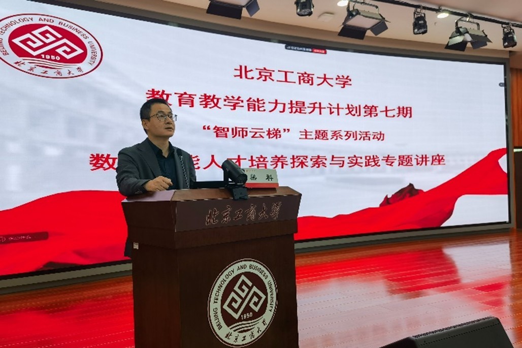 會上,金天教授以《數智賦能人才培養探索與實踐》為題,結合自身教學經驗,圍繞數智賦能人才培養探索與實踐、人工智能時代教育模式的變革和教學方法的創新與在場教師進行了深入的探討。他提出,AI時代的到來對教育領域產生了深遠的影響,教育工作者需要積極適應這一變革,利用AI技術改進教學方法。通過比學生更熟練地使用人工智能工具,引導學生合理使用AI,提高教學效率和質量。
