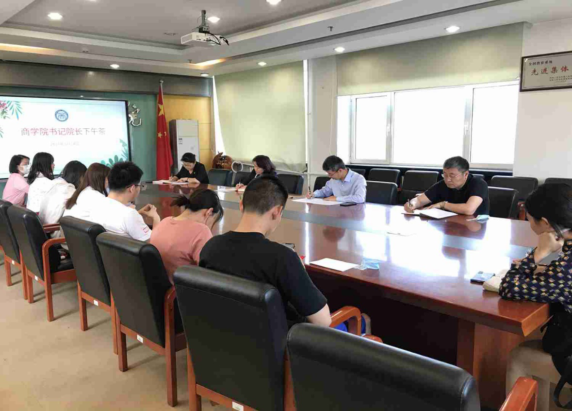 為暢通學院與學生之間的交流溝通,著力解決學生的“急難愁盼”問題,商學院于5月24日首次開展書記院長下午茶活動。學院黨委書記張春萍、院長毛新述、副院長孫永波、副院長張偉華、副書記張倩、研究生輔導員趙麗紅、趙杰和11名研究生參加了此次活動。活動由張倩主持。