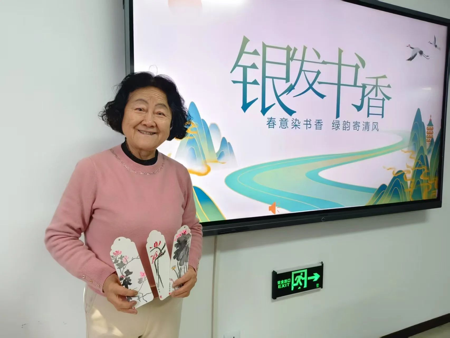 “一花一扇皆春意,半詩半畫總關(guān)情”,幾十張描繪著春天祝福和心愿的書簽連同二十余柄手繪團扇最后被集中懸掛展示于“春韻長廊”的文化墻上,老同志還親自票選出自己心目中的“銀齡佳作”,收藏起獨屬于自己的春意。