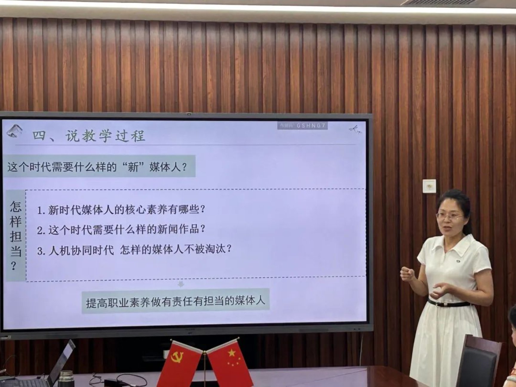 姜茹茹聚焦如何給“新傳”專業學生講好“時代責任擔當”。她從教材內容、學生學情和教學過程三個方面展開,在教材內容方面,將緒論中標題結合新聞傳播專業進行轉換;在學生學情分析上,涵蓋了學生知識基礎、能力基礎以及情感價值觀情況;在教學過程中,將黨的十九大報告提出的,中華民族迎來了站起來、富起來、強起來的偉大飛躍,以更易于新傳學生接受的方式開展教學。