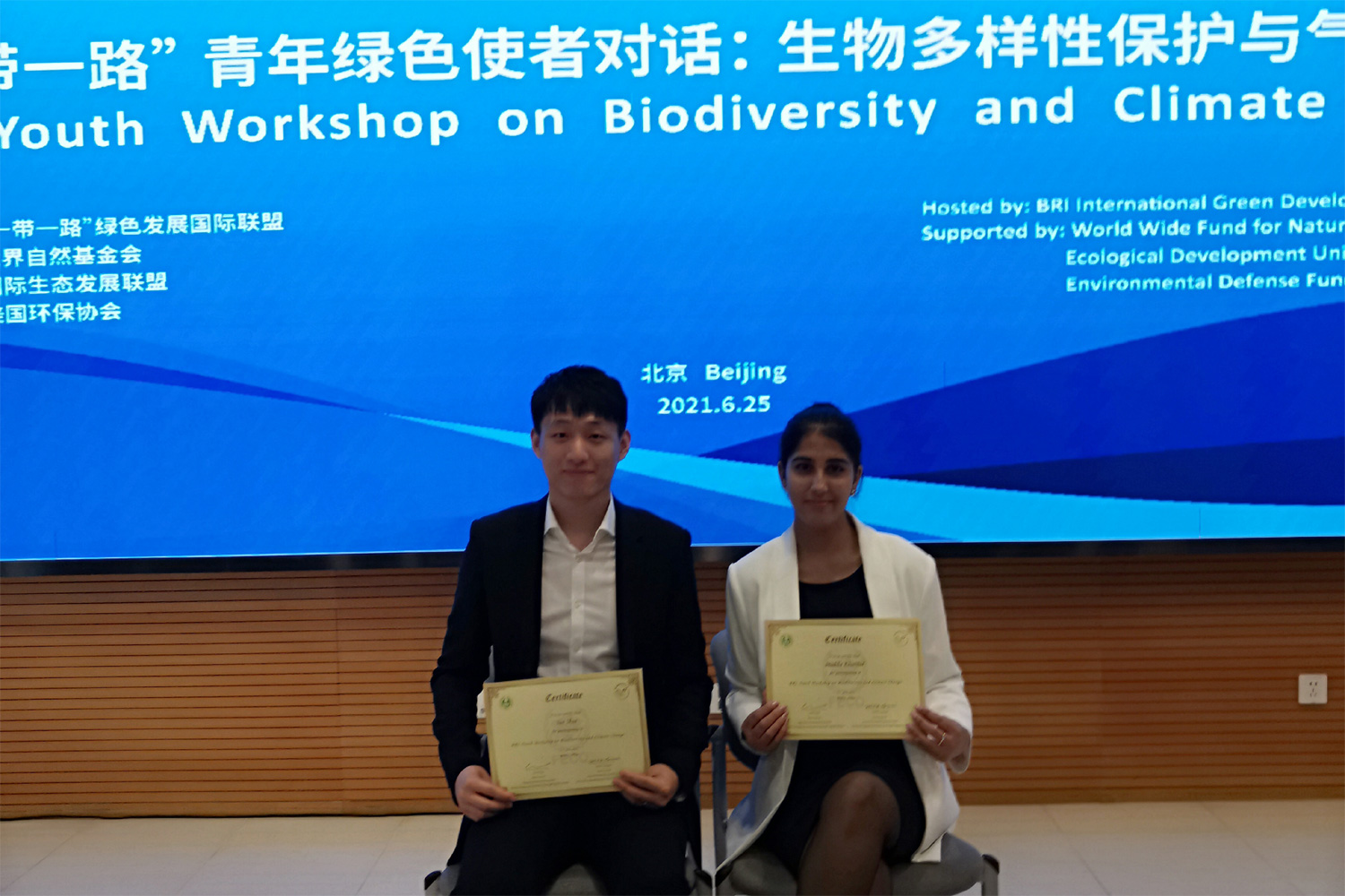 6月25日,“‘一帶一路’青年綠色使者對話:生物多樣性與氣候行動”在京召開。會議由中華人民共和國生態(tài)環(huán)境部和聯(lián)合國環(huán)境署共同發(fā)起建設(shè)的“一帶一路”綠色發(fā)展國際聯(lián)盟(BRI International Green Development Coalition)主辦,世界自然基金會(World Wide Fund for Nature,WWF),國際生態(tài)發(fā)展聯(lián)盟(Ecological Development Union International,EDUI)和美國環(huán)保協(xié)會(Environmental Defense Fund,EDF)協(xié)辦。生態(tài)環(huán)境保護領(lǐng)域的專家學者與來自剛果金、泰國、巴基斯坦、德國、比利時和中國等全球數(shù)十個國家或地區(qū)的青年學子50余人受邀參加了此次會議。我校2020級食品科學與工程博士研究生Madiha Khurshid和應(yīng)用經(jīng)濟學博士研究生閆碩參加會議并在會議上發(fā)言。