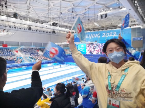 幸?;貞?,難舍冰雪之約。談起在雙奧會(huì)上的所見(jiàn)、所聞、所思、所感,10名志愿者百感交集、心潮澎湃。在志愿服務(wù)中,大家學(xué)習(xí)了冰雪知識(shí),掌握了工作技能,提高了自律意識(shí),強(qiáng)健了精神體魄,結(jié)下了深厚友誼。志愿者代表張雨昕談到:“冬奧時(shí)有個(gè)外國(guó)的工作人員很喜歡跟我們學(xué)中文,他學(xué)會(huì)了‘吃了嗎您那’、‘你瞅啥’等一系列中文,當(dāng)時(shí)說(shuō)得并不標(biāo)準(zhǔn),但十分愿意與我們交談,我感受到了志愿者之間不分國(guó)籍、最淳樸、最真實(shí)的友誼?!崩钚廊徽劦?,她在服務(wù)期間遇到了很多有趣的人,有塞給她每日?qǐng)?jiān)果的中國(guó)隊(duì)教練、有偷偷給她蘋果橘子的保潔阿姨、有怕她們冷而遞來(lái)熱水瓶的保安大哥,這些都是獨(dú)一無(wú)二的記憶。湯靜說(shuō):“當(dāng)我們用英語(yǔ)歡迎外國(guó)友人時(shí),他們會(huì)用中文‘謝謝’來(lái)回應(yīng)。”魏穎回憶在冬奧中國(guó)隊(duì)獲得首金舉行頒獎(jiǎng)典禮的晚上,遇到了5位運(yùn)動(dòng)員,她自發(fā)和朋友們唱起《歌唱祖國(guó)》。任子威接受采訪時(shí)熱淚盈眶地說(shuō)這一代年輕人充滿希望、可以為國(guó)家付出一切,她深深地為這種志愿者和運(yùn)動(dòng)員之間雙向奔赴的情感而感動(dòng)。李博雅說(shuō)起離開(kāi)場(chǎng)館時(shí)大屏幕上播放的‘山水總相逢,來(lái)日皆可期’字樣,眼含淚水。志愿期間,共同的使命、共同的經(jīng)歷把大家的心緊緊連在一起。每位志愿者的講述,把大家的思緒帶回了志愿服務(wù)那段難忘的時(shí)光,工作中的苦與樂(lè)、汗與淚又一幕幕地在腦海中浮現(xiàn)。大家紛紛表示,生逢盛世,當(dāng)不負(fù)盛世,能夠?yàn)榕e辦一屆精彩、非凡、卓越的奧運(yùn)盛會(huì)貢獻(xiàn)青春力量,能夠在冬奧第一線見(jiàn)證黨和國(guó)家走向復(fù)興、日益強(qiáng)盛的風(fēng)采,既是無(wú)上光榮也是寶貴財(cái)富,是值得一生回憶的難忘經(jīng)歷。