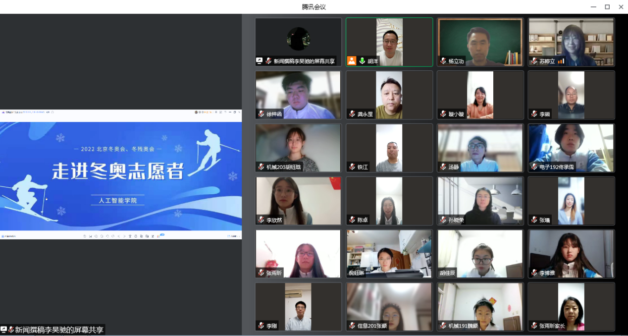 3月18日,人工智能學(xué)院召開(kāi)冬奧志愿者線上座談會(huì),交流冬奧“大思政課”收獲、暢談參與志愿服務(wù)的體會(huì),勉勵(lì)學(xué)院冬奧志愿者繼續(xù)發(fā)揚(yáng)“更高、更快、更強(qiáng)、更團(tuán)結(jié)”的奧林匹克精神和“奉獻(xiàn)、有愛(ài)、互助、進(jìn)步”的志愿精神,踐行“請(qǐng)黨放心,強(qiáng)國(guó)有我”的青春誓言,講好“踔厲奮發(fā),篤行不怠”的中國(guó)故事,書(shū)寫(xiě)“一起向未來(lái)”的美好篇章。學(xué)院黨委副書(shū)記楊立功、冬奧志愿者、家長(zhǎng)代表、班主任代表以及各年級(jí)輔導(dǎo)員參加了座談會(huì)。