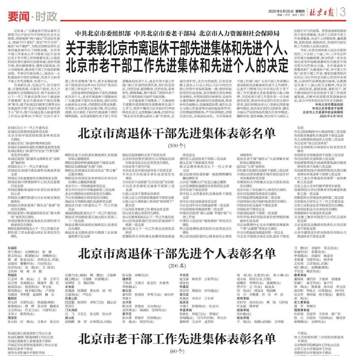 6月25日上午,北京市離退休干部慶祝中國(guó)共產(chǎn)黨成立104周年“雙先”表彰暨“六好”示范黨支部宣講報(bào)告會(huì)在北京會(huì)議中心隆重舉行。會(huì)議宣讀了中共北京市委組織部、中共北京市委老干部局、北京市人力資源和社會(huì)保障局《關(guān)于表彰北京市離退休干部先進(jìn)集體和先進(jìn)個(gè)人、北京市老干部工作先進(jìn)集體和先進(jìn)個(gè)人的決定》,表彰100個(gè)“北京市離退休干部先進(jìn)集體”、200名“北京市離退休干部先進(jìn)個(gè)人”、60個(gè)“北京市老干部工作先進(jìn)集體”和100名“北京市老干部工作先進(jìn)個(gè)人”。