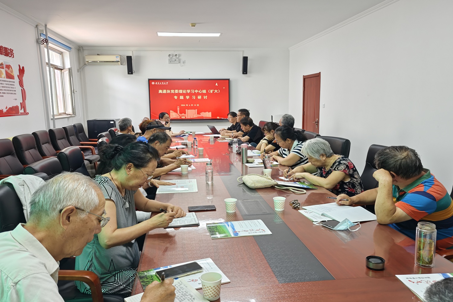 6月14日,離退休黨委理論學習中心組(擴大)專題學習研討會在阜成路西區老干部活動中心召開。旨在深入學習領會文件精神,強化黨紀學習教育,筑牢黨的紀律防線。離退休黨委理論學習中心組成員、離退休工作處處長樊江濤、離退休工作處副處長夏本翠、各離退休黨支部書記參會,會議由離退休黨委書記王紅英主持。