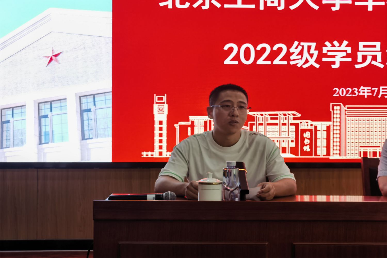 學員張存碩代表22級軍轉(zhuǎn)培訓班學員發(fā)言,他首先感謝北京市退役軍人事務部和北京工商大學提供這么好的學習機會,感謝每一位老師的悉心教導和精彩授課。他表示此次培訓不僅深入理解了新形勢下中國特色社會主義道路、馬克思主義原理在中國的應用等創(chuàng)新理論,也學習掌握了組織行為學、創(chuàng)新創(chuàng)業(yè)研究、企業(yè)戰(zhàn)略研究等與軍轉(zhuǎn)從事的管理崗位高度契合的專業(yè)知識。最后,他代表軍轉(zhuǎn)干部鄭重承諾,以此次學習培訓為契機,重新審視肩負的責任和使命,更好的服務于社會和人民,在未來的工作崗位上奉獻青春和力量。