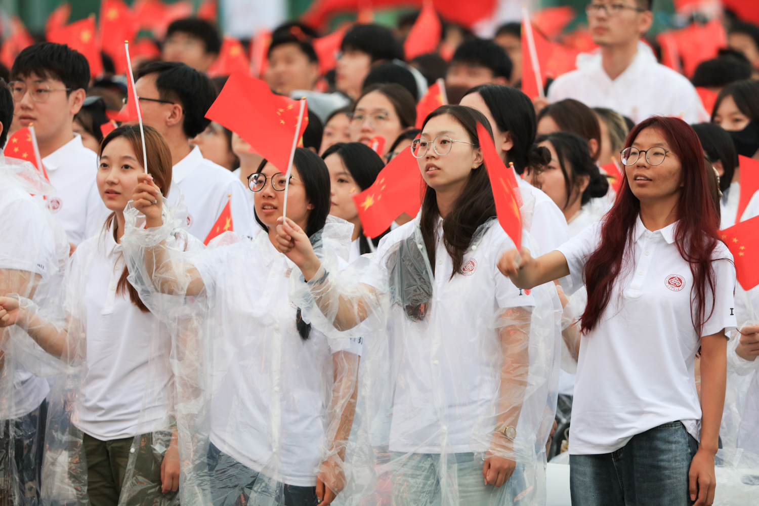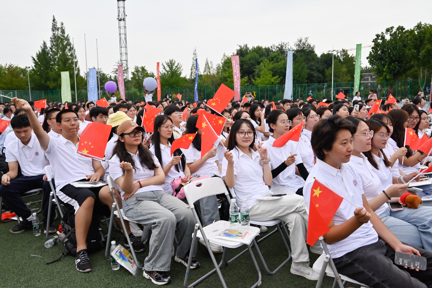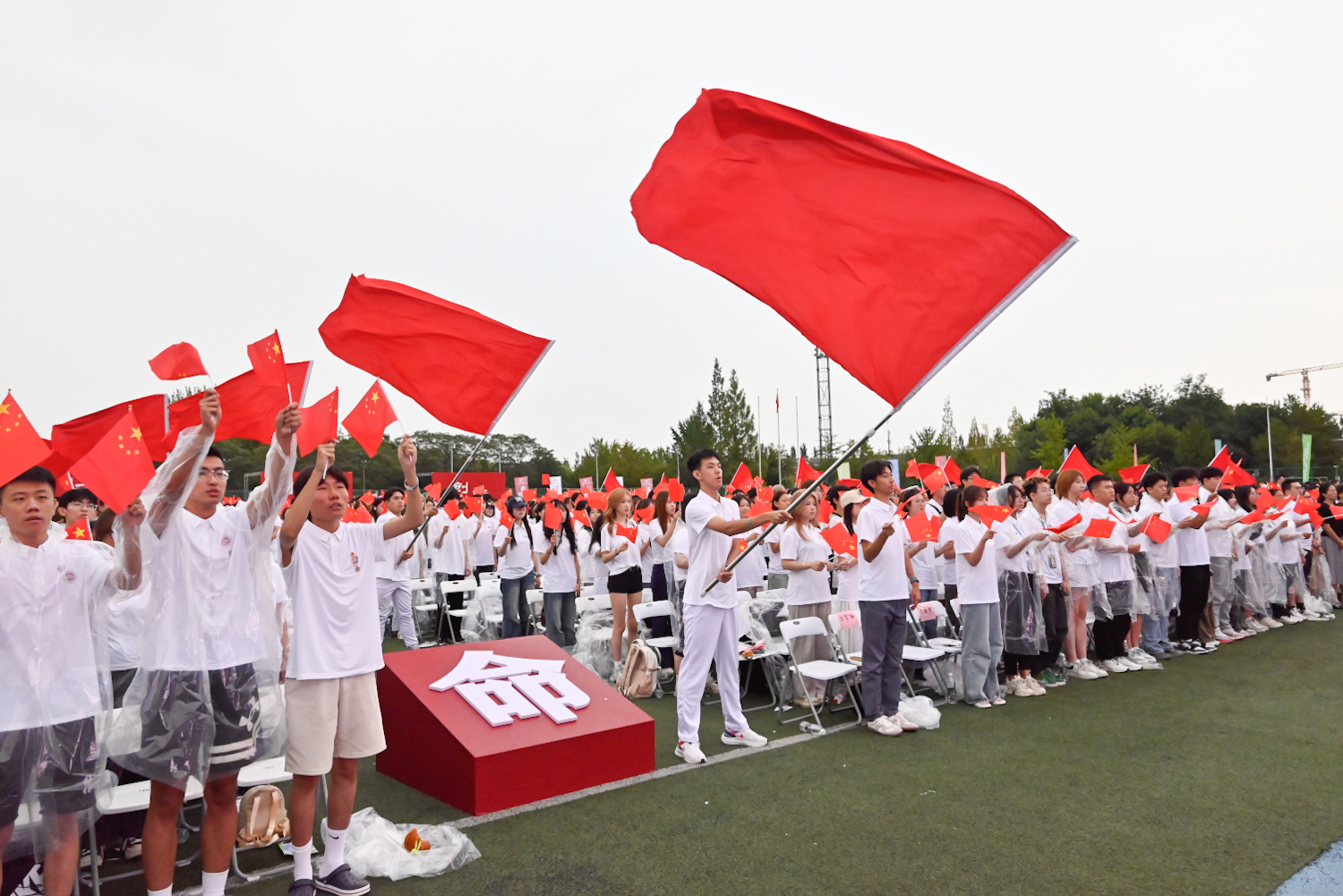 志愿者手持旗幟,從四面八方匯聚到主席臺前,揮舞的旗幟獵獵作響,為此次開學典禮畫上了完美的句號。