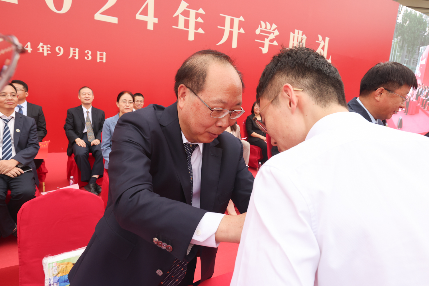 校領導為新生代表佩戴?;?,全體新生起立,鄭重地將?;张宕饔谛厍?。“求真、立德、勤奮、創新”校訓精神奔涌在一代代北工商人血液中,搏動在一代代北工商人心跳間。從佩戴上校徽的這一刻起,北工商校訓在2024級北工商學子身上得到新的傳承,煥發新的生機,匯聚新的時代力量。