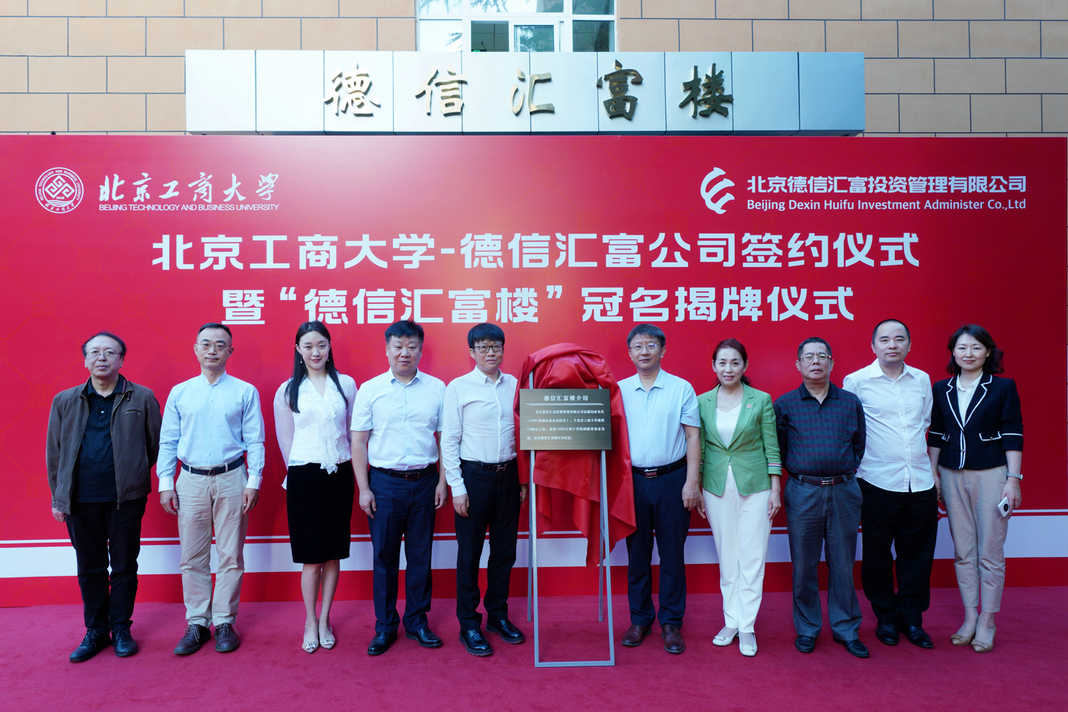 北京德信匯富投資管理有限公司合伙人劉子琳,公司副總裁、86儲運專業校友王肖男,公司投資總監袁飏,公司投資經理白玲,北京鼎盛美華國際貿易有限公司董事長、83儲運專業校友張桂榮,北京中儲物流有限責任公司總經理、83儲運專業校友陳維,加績(上海)科技服務有限公司董事長、01國際經濟與貿易專業校友安東,北京工商大學學校辦公室(校友會、教育基金會)、教務處、研究生院、國有資產管理處負責人,以及商學院、電商與物流學院領導班子成員、系主任和師生代表等一同參加了冠名揭牌儀式。