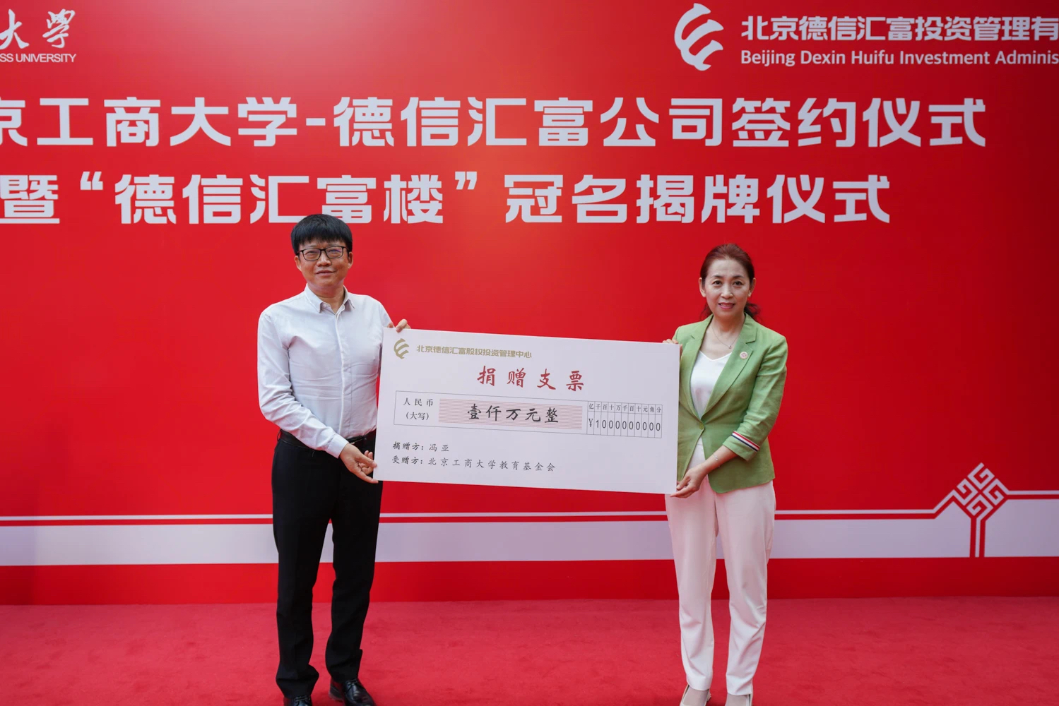 郭建華代表學校向馮亞和北京德信匯富投資管理有限公司情系母校、捐資助教的慷慨之舉表示衷心的感謝和崇高的敬意。他指出,馮亞是我校優秀校友的代表,他所創立的北京德信匯富投資管理有限公司秉承“誠德守信,穩健創新”的理念,聚焦高新技術產業投資,促進社會資源有效配置,已經成為我國實力雄厚、聲譽卓越的知名私募股權投資機構。繼捐贈100萬元設立“商科才俊獎學金”,助力學校人才培養后,馮亞再度捐資1000萬元,冠名阜成路校區西區教三樓為“德信匯富樓”,支持學校發展建設。期待在馮亞和北京德信匯富投資管理有限公司的參與和支持下,共同提升校企協同創新能力和服務社會水平,共同打造產教融合、校友參與、校企合作的標桿典范。