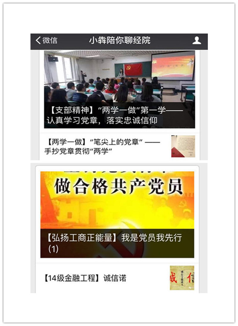 學生黨員勇于“發聲”,通過學院微信平臺“小犇陪你聊經院”,每天推出一期學生黨員“弘揚工商正能量”公益語音活動,由學生黨員錄制1分鐘微音頻,圍繞尊師重道、感恩父母、衛生宿舍、文明禮儀、節約用水、安全用電、走下網絡、走出宿舍、走向操場等為主題展開“發聲”號召,通過線上線下互動結合,向在校學生弘揚工商正能量,傳播核心價值觀。