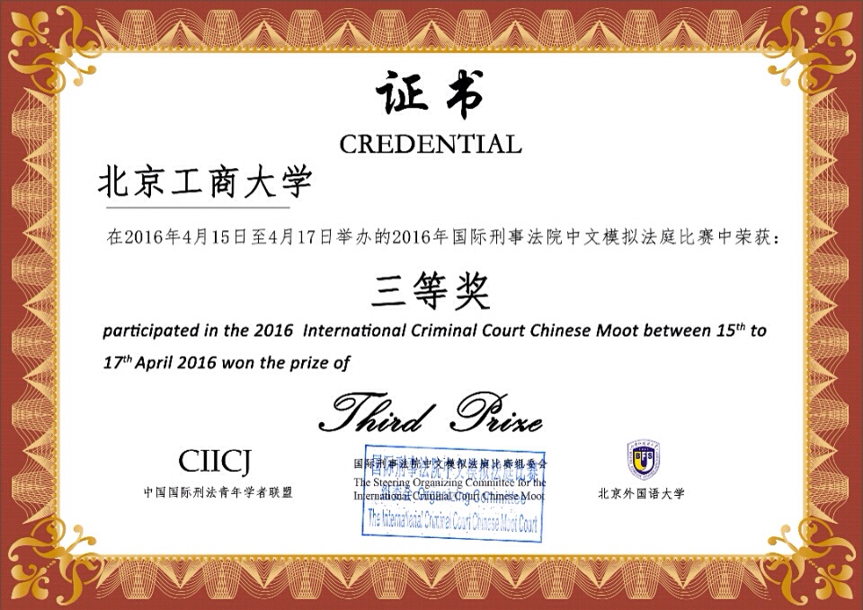 4月15日至17日,2016年國際刑事法院中文模擬法庭競賽在北京外國語大學舉辦。我校法/馬學院賽隊與來自北京大學、清華大學、香港中文大學等共27支賽隊齊聚北外,展現北工商學子的風采。本屆賽事分為書狀和庭辯兩個獨立單元評分。書狀和正賽法官由來自外交部、國防部、國際組織、法院、高校、律師事務所的56名國際法學界專家組成。