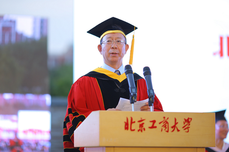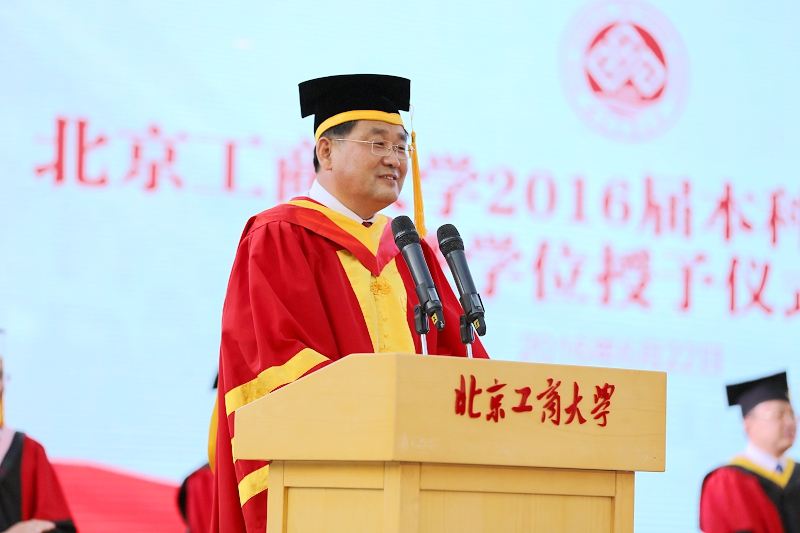 校長孫寶國院士在發言中,代表學校黨委和行政向圓滿完成學業的同學表示熱烈祝賀,向付出辛勤勞動的全體教職員工表示衷心感謝,向參加畢業典禮的家長致以誠摯問候。孫校長肯定了2016屆本科畢業生在學期間在學習、競賽、實踐等方面取得的喜人成績,并為同學們通過辛勤付出在就業、升學等方面取得的豐碩成果感到驕傲。他提到,2016屆畢業生中有27人次獲得國家獎學金,有302人次在各類競賽中獲得市級以上榮譽,有96人次獲得“校園之星”榮譽稱號,有24人被評為“北京市三好學生”,有135人被評為“北京市優秀畢業生”,有358名同學考上了北京大學、清華大學等單位的研究生,有317名同學出國深造,有12名同學投筆從戎,有83名同學志愿到基層建設美麗鄉村。孫校長給畢業生們兩條贈言:第一,大學畢業意味著新的開始,只要同學們在今后的工作、學習中能夠認準目標、腳踏實地、持之以恒、堅忍不拔必定會出類拔萃。孫校長還以近兩年我校國家英語四級考試排名和中國大學本科畢業生薪酬排名不斷上升為例勉勵大家積極進取,成為北工商的驕傲!第二,希望同學們今后凡事先替別人、替單位、替國家和社會想一想,先天下之憂而憂,后天下之樂而樂。孫校長談到,今年學校啟動了校友值年返校活動,希望再過10年,看到2016屆畢業生返校時的英姿和學校新的風采。希望大家共同努力打造北工商和北工商校友明天的輝煌!母校也將永遠惦記著大家,并為大家祝福!