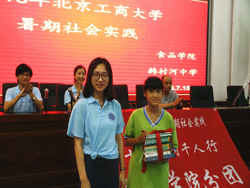韓村河中學老師對參與本次實踐活動的學生提出了具體要求和殷切希望。食品學院帶隊老師劉晶提出在學校開展十鄉百村千人行暑期社會實踐第12個年頭,希望所有參與實踐的同學在學中玩出樂趣,兩校間友誼傳承下去。帶隊老師王釗在講話中表示很榮幸參與到暑期社會實踐活動中,并預祝此次實踐活動圓滿成功。食品學院的實踐團成員以及韓村河中學的同學們都對未來的實踐活動充滿期待。在對接儀式上還進行了書籍贈予儀式,食品學院學生將自己平時閱讀中發現的充滿正能量的書籍贈給對接校同學,體現了兩校學生深厚的友誼。