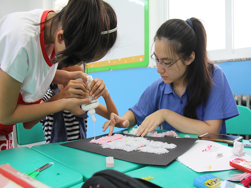 在老師的耐心演示和指導下,學生以小組為單位領取材料,以“森林”為主題展開頭腦風暴,嘗試紙繩毛線拼貼畫創作。下課前,學生們上臺展示手工成果,用英語分享制作心得,在手工學習的同時鍛煉英文口語表達,將語言能力和動手能力相結合,增加課程趣味性和學生成就感。