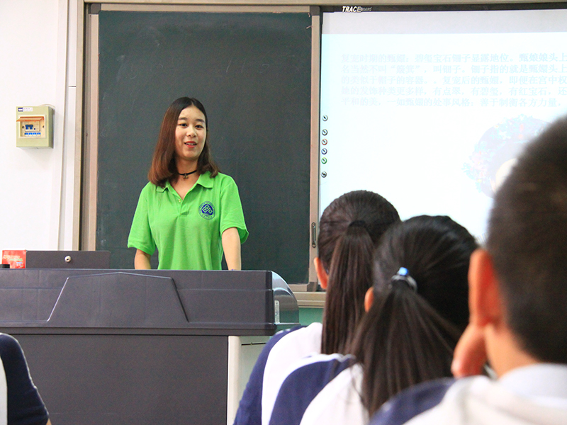 “顏值爆表”班小講師趙瑞萌以《甄嬛傳》為例講解其中的古代服飾,同學們被圖片中精美的服飾吸引,不由地討論起來并拋出一些問題,老師也為他們一一解答。第二節課,張斯博老師在黑板上為同學們演示國畫的創作過程,不僅吸引了學生,而且引來了一些小教師們前來聽課。同學們一筆一劃地跟著老師臨摹,并表示要將畫好的國畫保存好,為自己留一份美好的記憶。