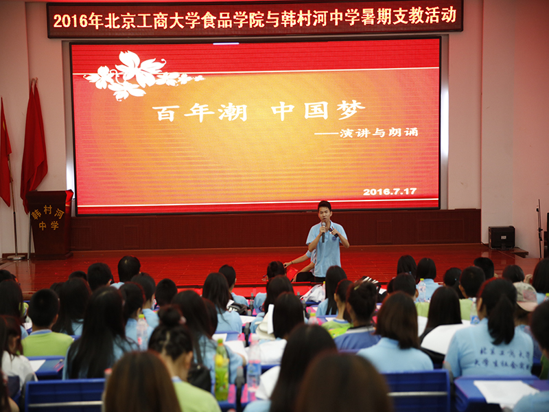 在隨后的演講課中,實踐團的小老師先給大家放了一段“百年朝,中國夢”的視頻,每個人都認真地觀看著視頻,孩子們在小老師們的引導下又各自暢談了自己的夢想,這些夢想或大或小,但無一不讓實踐團的成員們看到了民族復興的希望!隨后,小老師又問大家什么是中國夢?對于我們大學生來說,中國夢這個詞并不陌生。每一年,我院都會開展一系列培育和餞行社會主義核心價值觀活動。那對于一個中學生呢?課堂又安靜了下來,小老師為眾人解答,中國夢就是中華民族偉大復興的夢。民族復興,就是國家富強,也是我們提倡的社會主義核心價值觀的重中之重。接下來,實踐團的成員潘健安為大家做了以“中國夢”為主題的演講。他回憶了中國百年來的近代史,講述了我們民族的中國夢。他的抑揚頓挫,他的慷慨激昂讓在座的每一個人為之動容。主題演講結束后,小朋友們在實踐團成員趙曉慶的帶領下深情地朗誦了《贊美》,表達了他們對祖國深深的敬意。