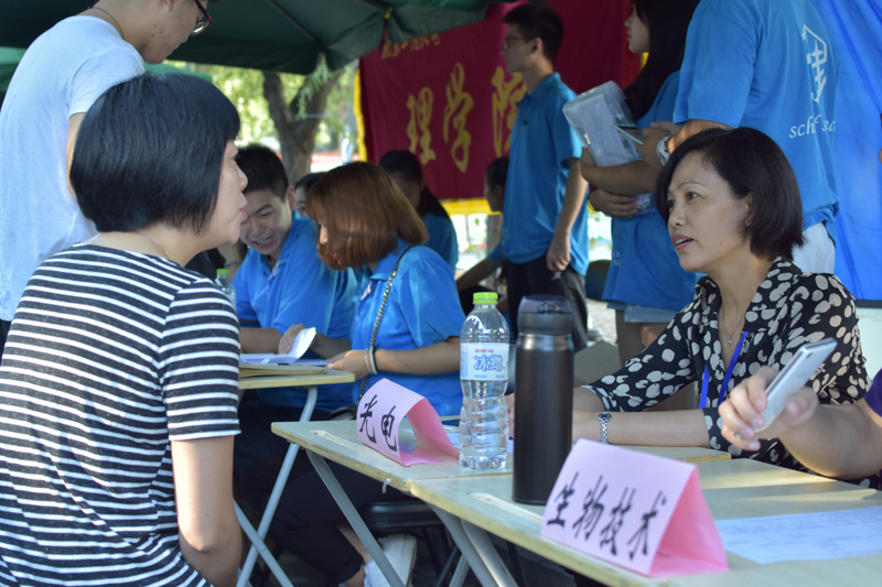 在迎新現場我們還看到了很多班主任,由教授擔任班主任在我校已是第二年實施。他們中不僅有資深的學術專家,也有年輕有力的青年骨干。其中不少老師已多年擔任班主任工作,具有豐富的經驗。今天,他們也一早來到現場,了解學生報到情況,與學生親切交流,并深入了宿舍,了解學生住宿情況。