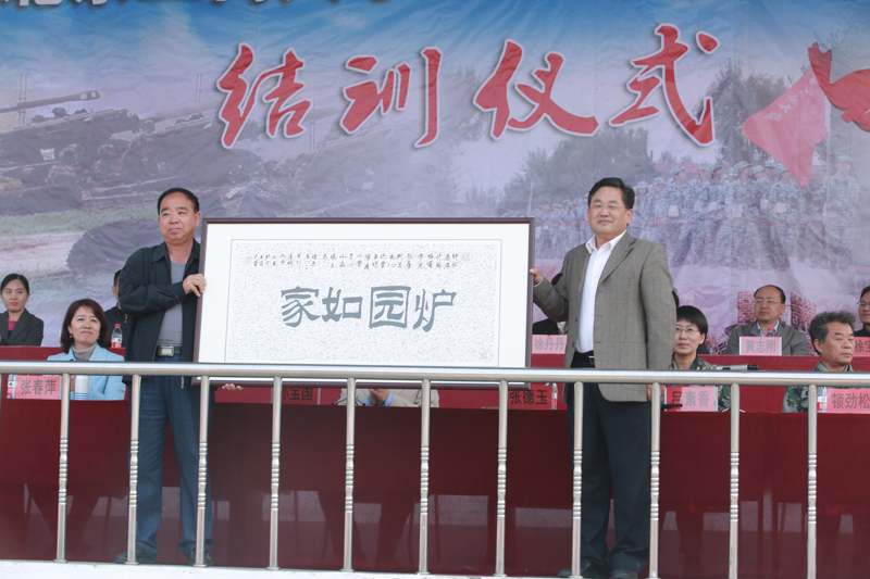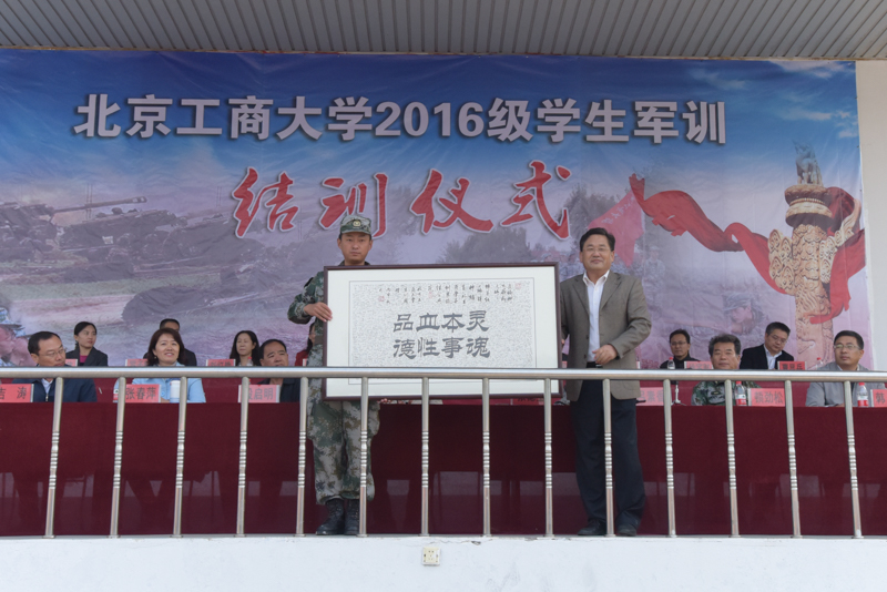 黨委副書記張德玉代表學校向承訓部隊和北京康莊611軍訓基地分別贈送了由2016級學生書寫、包含2000多名學生簽名的兩幅書法作品,表達誠摯謝意。