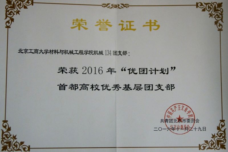11月29日下午,2016年“優團計劃”首都高校優秀基層團支部評選總結表彰會在中國人民大學舉行。在校團委的組織推薦下,我校材料與機械工程學院機械134團支部榮獲2016年“優團計劃”首都高校優秀基層團支部。