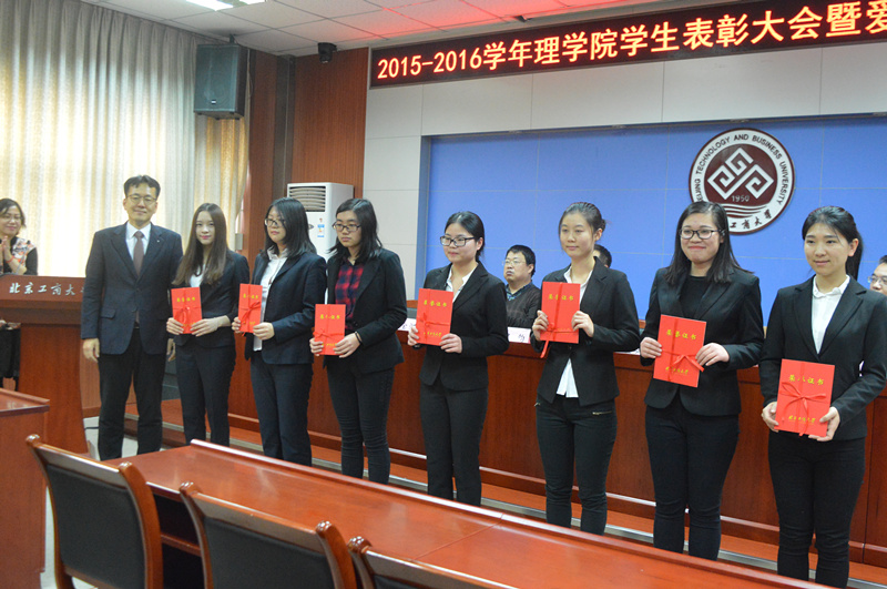 祝鈞宣讀了關(guān)于表彰2015-2016學(xué)年學(xué)生先進(jìn)集體、先進(jìn)個人及優(yōu)秀學(xué)生獎學(xué)金獲得者的決定,學(xué)院領(lǐng)導(dǎo)為獲獎同學(xué)頒獎。獲得國家獎學(xué)金的葉蘋同學(xué)代表發(fā)言,她感謝學(xué)校和學(xué)院給予自己的榮譽,向同學(xué)們介紹了自己的學(xué)習(xí)方法及經(jīng)驗,并表示會加倍努力、回報社會。延在昊為獲得“愛茉莉”獎學(xué)金的同學(xué)頒獎,并表達(dá)了對同學(xué)們的美好期望。獲獎學(xué)生送上了親手制作的精美禮物,以表達(dá)他們對“愛茉莉”公司的感謝。