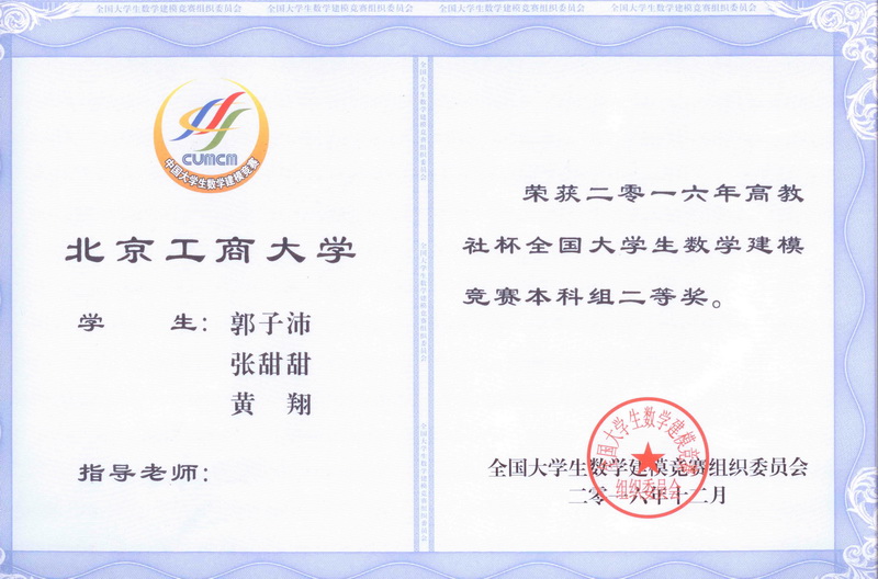 日前,2016年全國大學(xué)生數(shù)學(xué)建模競賽獲獎名單公布,我校32支參賽隊(duì)伍經(jīng)過緊張奮戰(zhàn),最終獲得了全國二等獎1項(xiàng)、北京市一等獎1項(xiàng)、北京市二等獎2項(xiàng),成功參賽獎28項(xiàng)。來自經(jīng)濟(jì)學(xué)院金融工程142班的郭子沛、張?zhí)鹛鸷忘S翔團(tuán)隊(duì),經(jīng)專家評審、現(xiàn)場答辯后脫穎而出,進(jìn)入全國會評,最終獲得全國二等獎。這也是我校學(xué)子再次獲得數(shù)學(xué)建模國家級獎項(xiàng)。