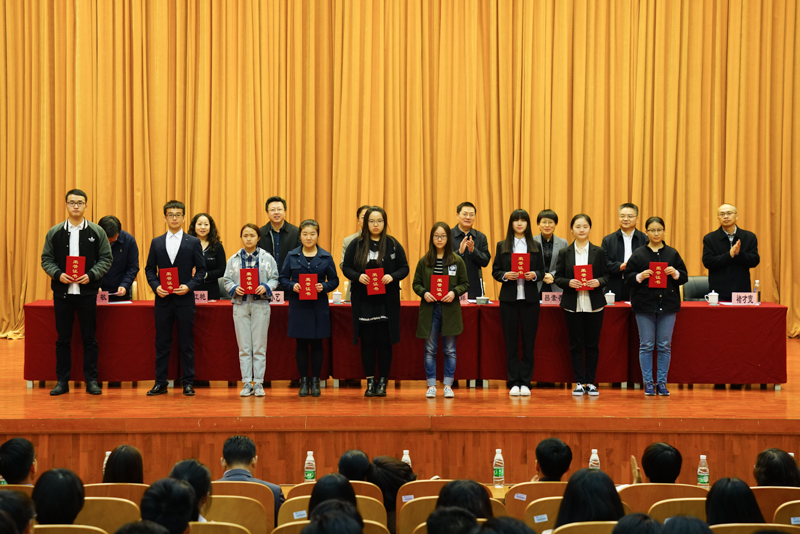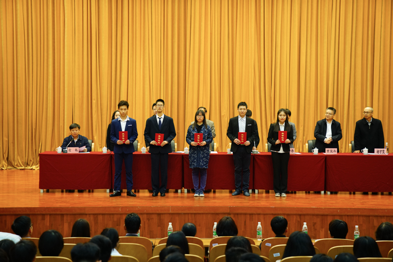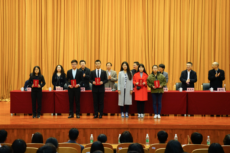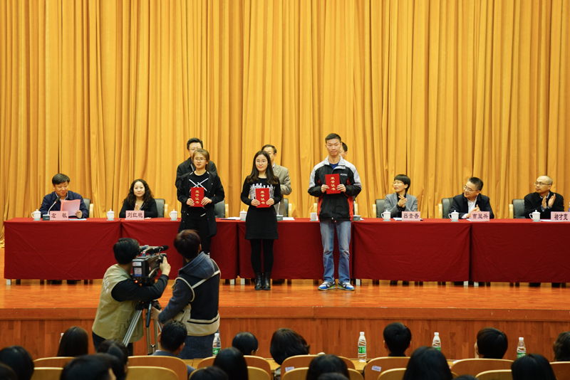 副校長李朝鮮宣讀了《北京工商大學關于表彰2016年12月份全國大學英語四六級考試成績優(yōu)異學生及2016年秋數(shù)學競賽獲獎學生的決定》。此次學校表彰了114名大學英語四六級考試成績優(yōu)異的學生,其中英語四級一等獎7人、二等獎15人、三等獎25人、優(yōu)秀獎64人,英語六級優(yōu)秀獎3人;表彰了25名在美國大學生數(shù)學建模競賽、國家大學生數(shù)學建模競賽、國家大學生數(shù)學競賽中獲獎的學生;還表彰了90名在校內(nèi)數(shù)學競賽中獲獎的學生。在師生們的掌聲中,獲獎學生分別上臺領獎并與頒獎的領導、老師合影留念。